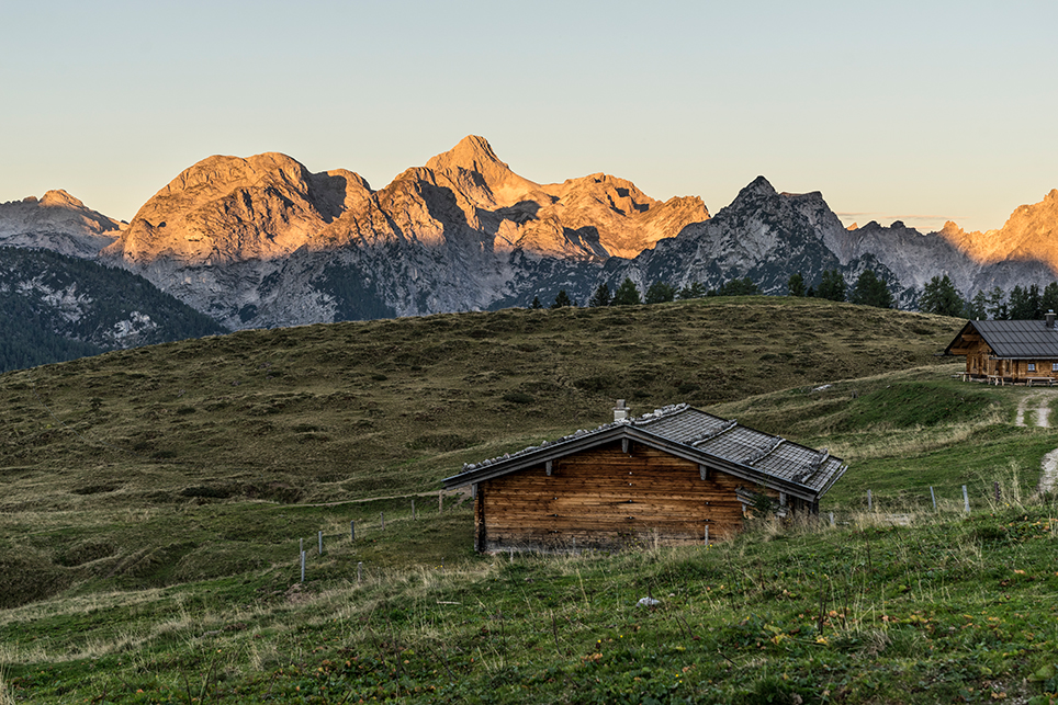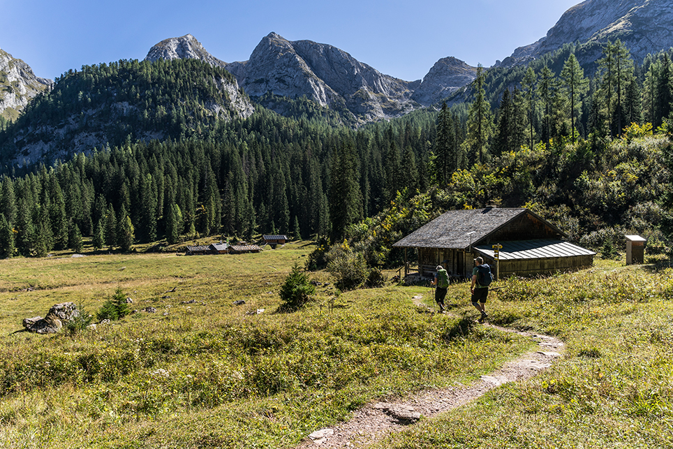 Der Morgen begrüßt uns mit Reif, Nebel und blauem Himmel. Ein schmaler Steig führt hinunter zum Grün- und dann wieder hinauf zum Schwarzensee, beide still, kalt und wunderschön. Über das aussichtsreiche Halsköpfl geht es zur Wasseralm, der wohl ursprünglichsten Unterkunft in den Berchtesgadener Alpen. Nach der Pause queren wir den Röthbach, der wenig später als Röthbachfall 400 Meter in die Tiefe stürzt. Wir bleiben oben und folgen dem drahtseilgesicherten Landtalsteig. Dann geht es noch einmal 500 sonnige Höhenmeter empor, bevor wir über ein luftiges, aussichtsreiches Grasband zur Gotzenalm wandern. Nach acht Stunden kommen wir müde, aber glücklich an. Der kurze Abstecher zum Feuerpalfen lohnt sich unbedingt: Der Tiefblick auf St. Bartholomä und die gewaltige Ostwand des Watzmanns gehört zu den besten Aussichten im gesamten Nationalpark.