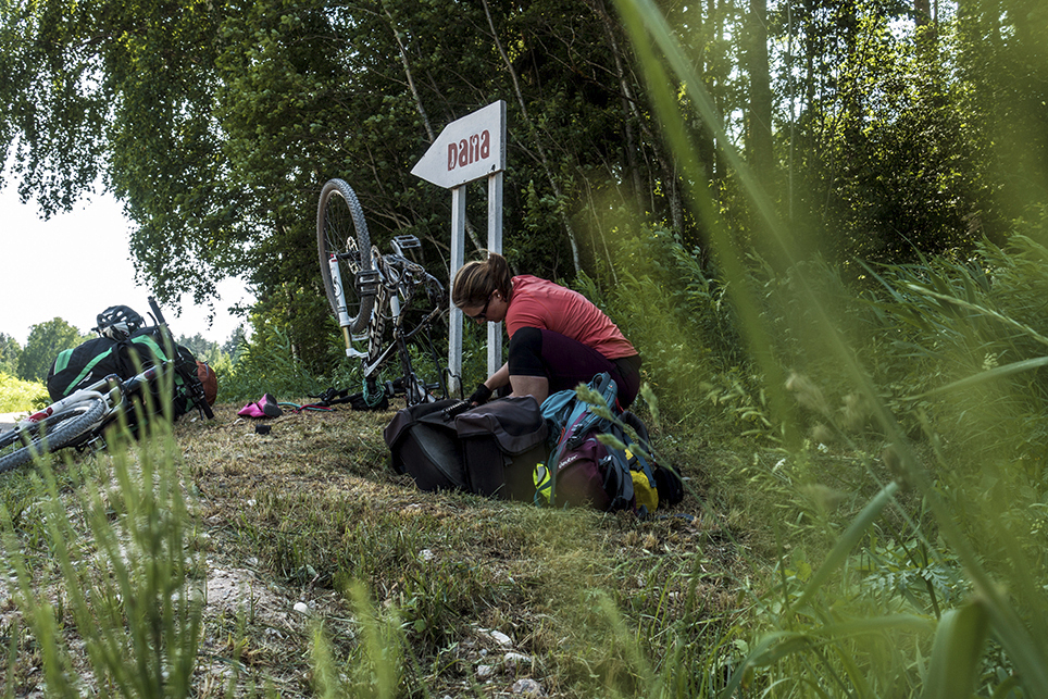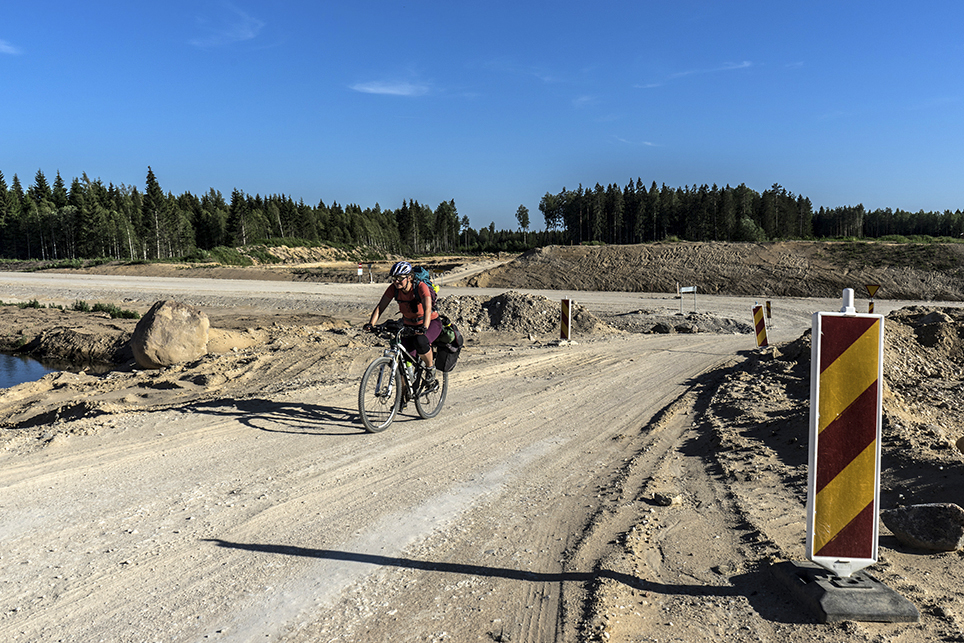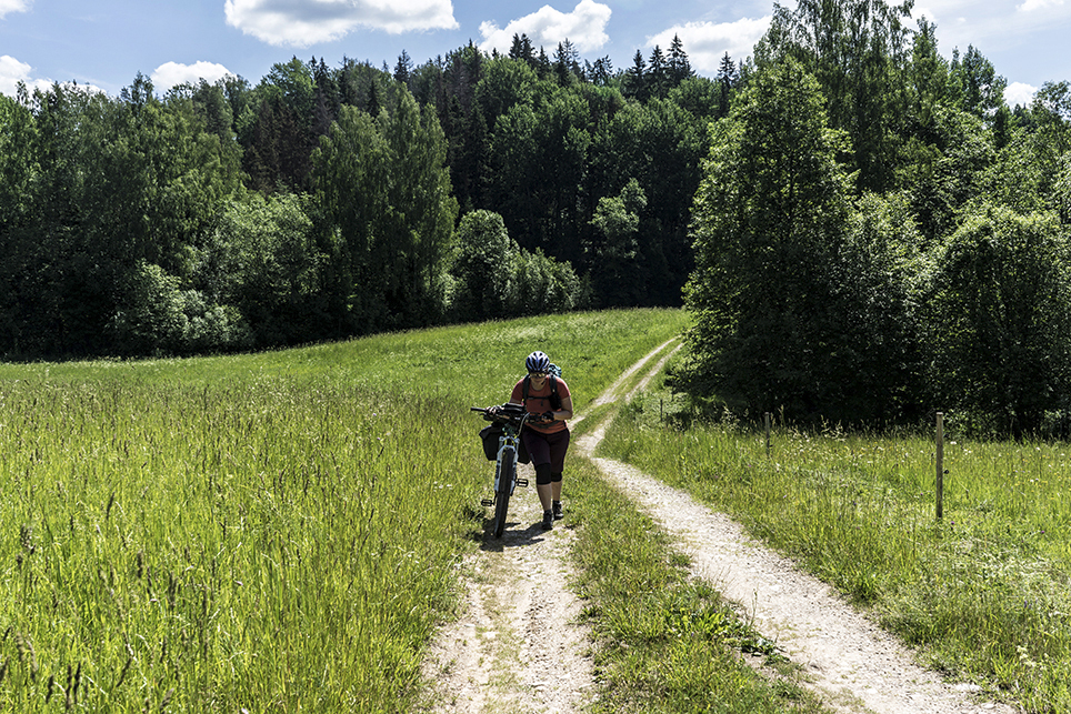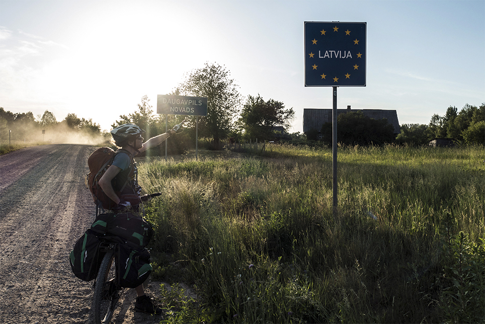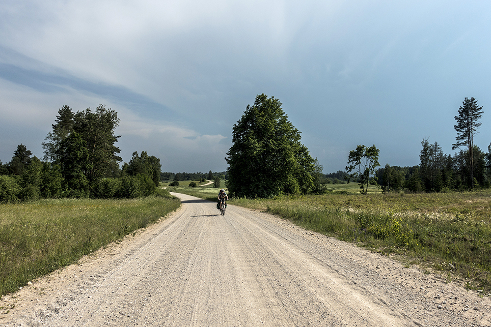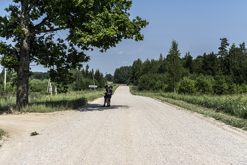 Bereits am dritten Tag betreten wir an einem winzigen Grenzübergang erstmals lettischen Boden. War es bisher schon sonnig und warm, knacken wir inzwischen deutlich die 30 Grad-Marke und nur mehr selten sorgen schattige Wälder für eine Erholung zwischen dem der Sonne schutzlos ausgelieferten Weideland. Auch Asphalt findet sich nur noch auf den größten Hauptstraßen, was eigentlich kein Drama ist, da wir mit robusten Mountainbikes unterwegs sind. Allerdings ist der Belag meist so schlecht, dass wir uns entweder durch losen Sand kämpfen müssen oder auf regelrechtem Wellblech nach allen Regeln der Kunst durchgeschüttelt werden.