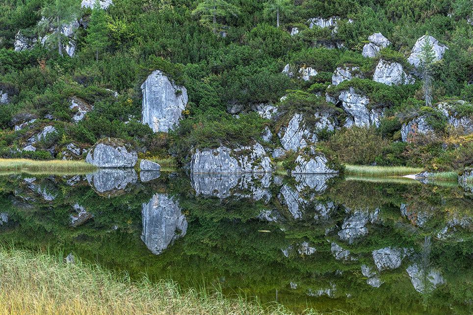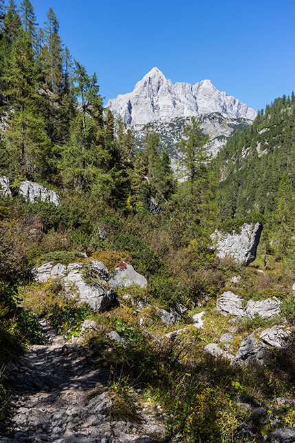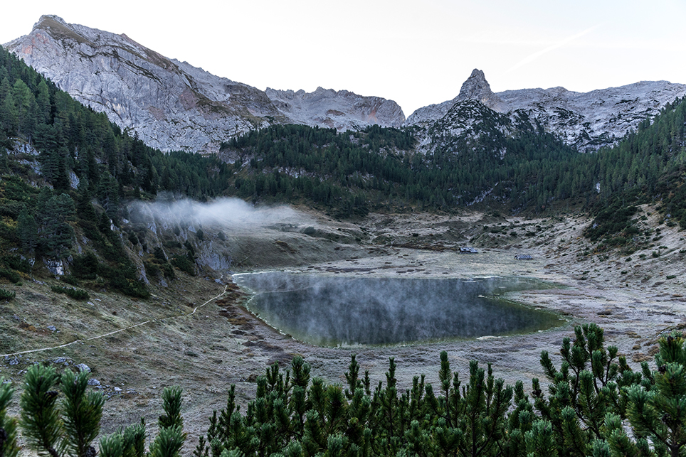 Der Morgen begrüßt uns mit Reif, Nebel und blauem Himmel. Ein schmaler Steig führt hinunter zum Grün- und dann wieder hinauf zum Schwarzensee, beide still, kalt und wunderschön. Über das aussichtsreiche Halsköpfl geht es zur Wasseralm, der wohl ursprünglichsten Unterkunft in den Berchtesgadener Alpen. Nach der Pause queren wir den Röthbach, der wenig später als Röthbachfall 400 Meter in die Tiefe stürzt. Wir bleiben oben und folgen dem drahtseilgesicherten Landtalsteig. Dann geht es noch einmal 500 sonnige Höhenmeter empor, bevor wir über ein luftiges, aussichtsreiches Grasband zur Gotzenalm wandern. Nach acht Stunden kommen wir müde, aber glücklich an. Der kurze Abstecher zum Feuerpalfen lohnt sich unbedingt: Der Tiefblick auf St. Bartholomä und die gewaltige Ostwand des Watzmanns gehört zu den besten Aussichten im gesamten Nationalpark.