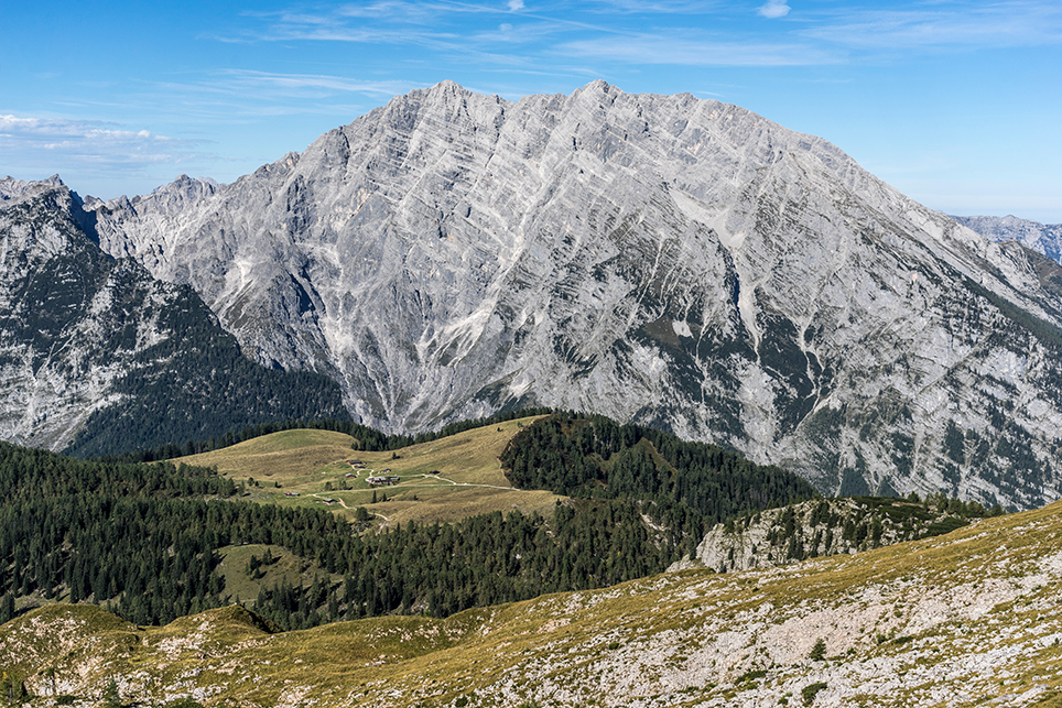 Am dritten Tag erklimmen wir zunächst das Hohe Laafeld. Auf schmalen Pfadspuren steigen wir durch die Bärengrube auf, queren zerklüftetes Karstgelände und stehen schließlich am stillen 2.074-Meter-Gipfel. Vor uns breiten sich die Berge der Berchtesgadener Alpen aus: Funtenseetauern, Großer Hundstod, Watzmann, Göll und Untersberg – ein wahnsinns Panorama. Über die steile Frauenwand geht es anschließend hinunter zum Seeleinsee, der türkis und bisher noch still unter dem Kahlersberg ruht. Ab der Priesbergalm werden die Wege belebter; an der Königsbachalm gönnen wir uns ein letztes Radler, bevor wir über den Hochbahnweg nach Schönau absteigen, wo die Königssee-Umrundung ihr Ende findet.