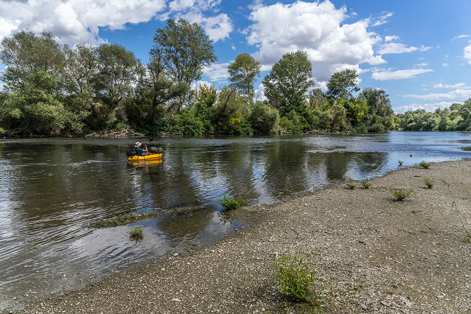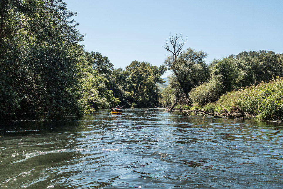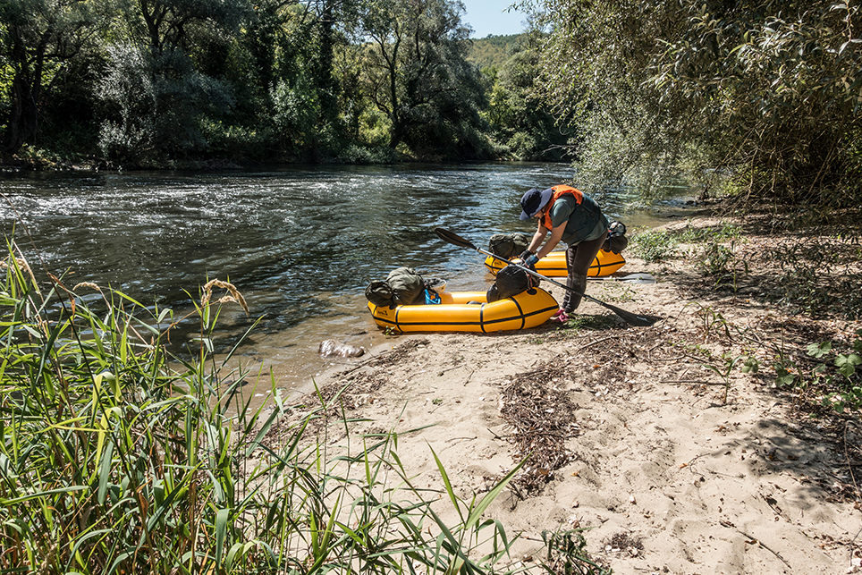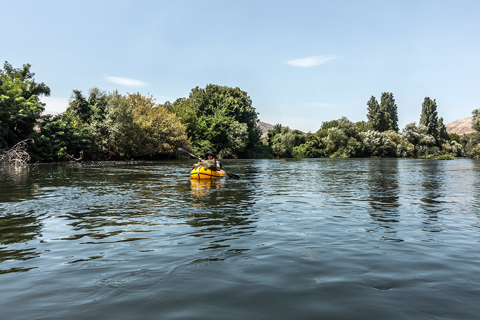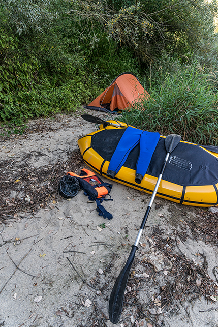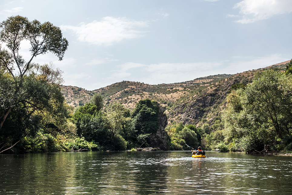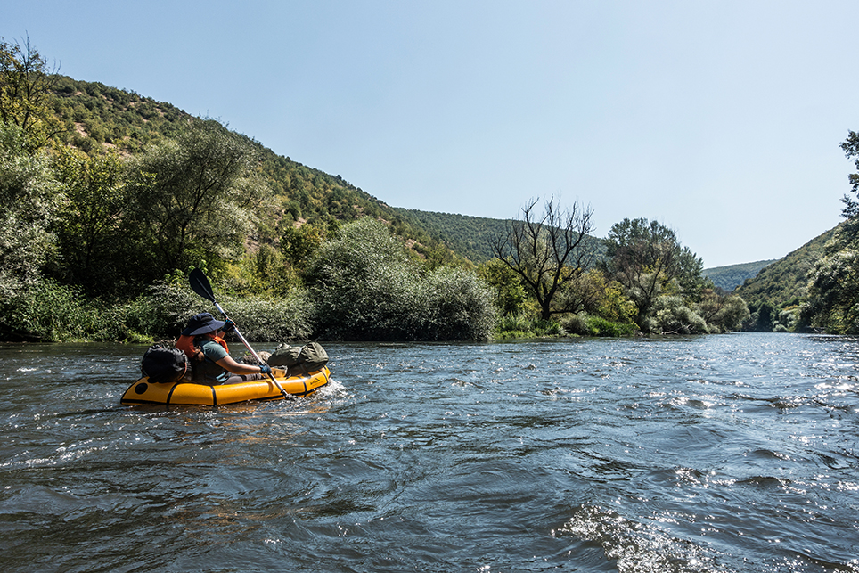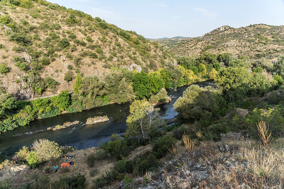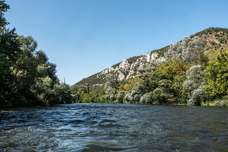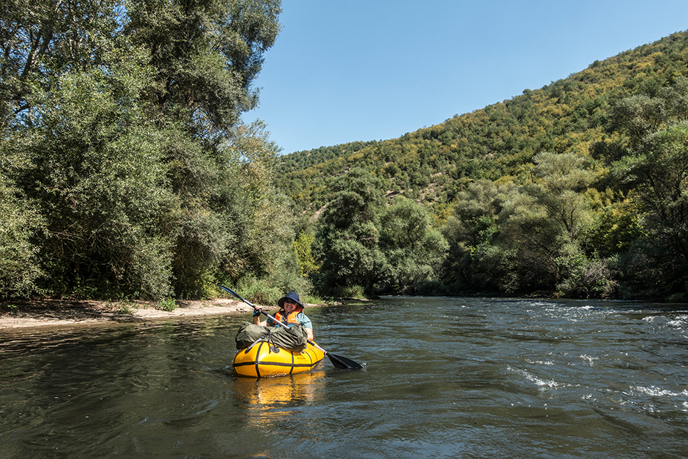 Doch die Ernüchterung folgt schnell. Der Vardar ist wunderschön – die Landschaft weit, warm und einladend –, und umso schmerzlicher trifft uns der Müll, der streckenweise an seinem Ufer liegt. Man verzweifelt fast, wenn man sieht, wie achtlos manche Menschen mit ihrem Land umgehen. Je weiter wir uns jedoch von Skopje entfernen, desto besser wird es; das Flusswasser trinken wir dennoch lieber nicht. Am Ende des ersten Tages erreichen wir den Beginn der Taor-Schlucht, in der der Fluss die Ausläufer des bis zu 2.500 Meter hohen Jakupica-Gebirges durchfließt. Die Dörfer weichen zurück, die Hügel rücken näher zusammen und der Fluss zieht kurvenreich durch das bewaldete Tal. Kleine Schwallstrecken machen das Paddeln lebendig, an einem Sandstrand bauen wir schließlich das Zelt auf – ein Ort, so friedlich und still, dass fast ein wenig Südsee-Feeling aufkommt.