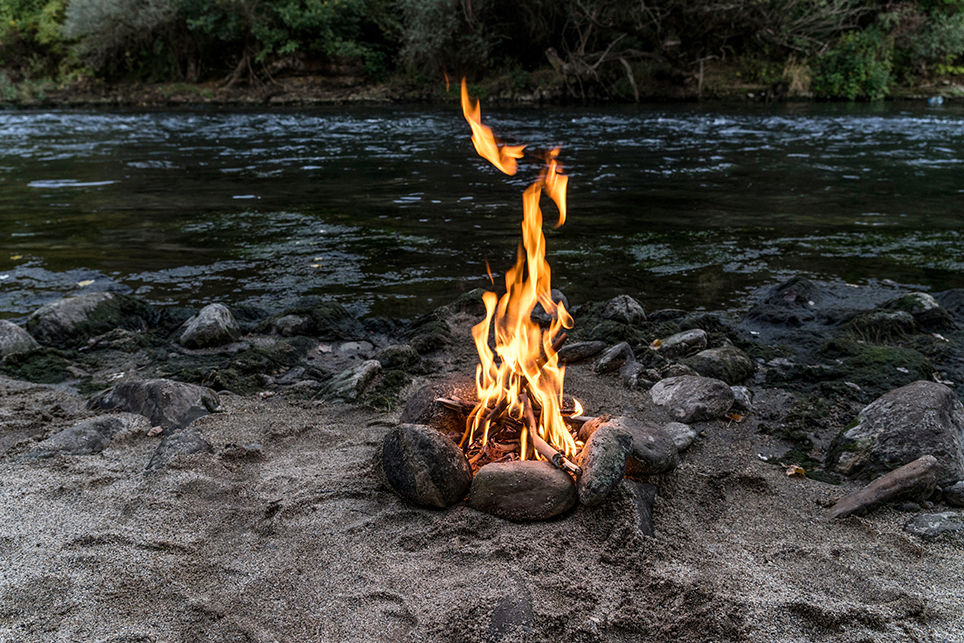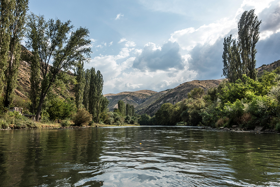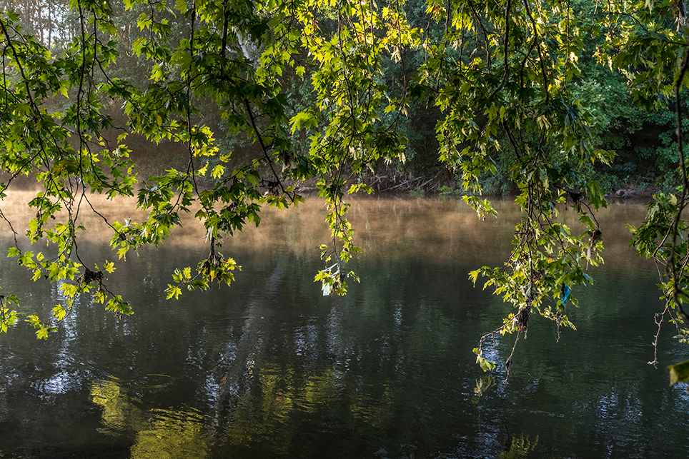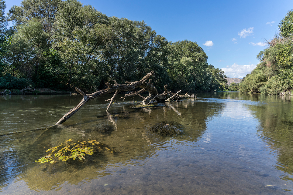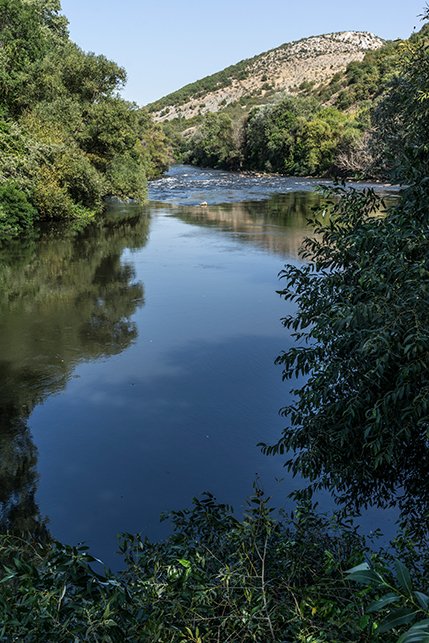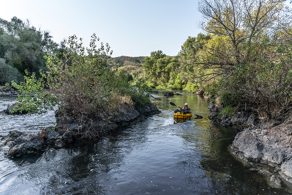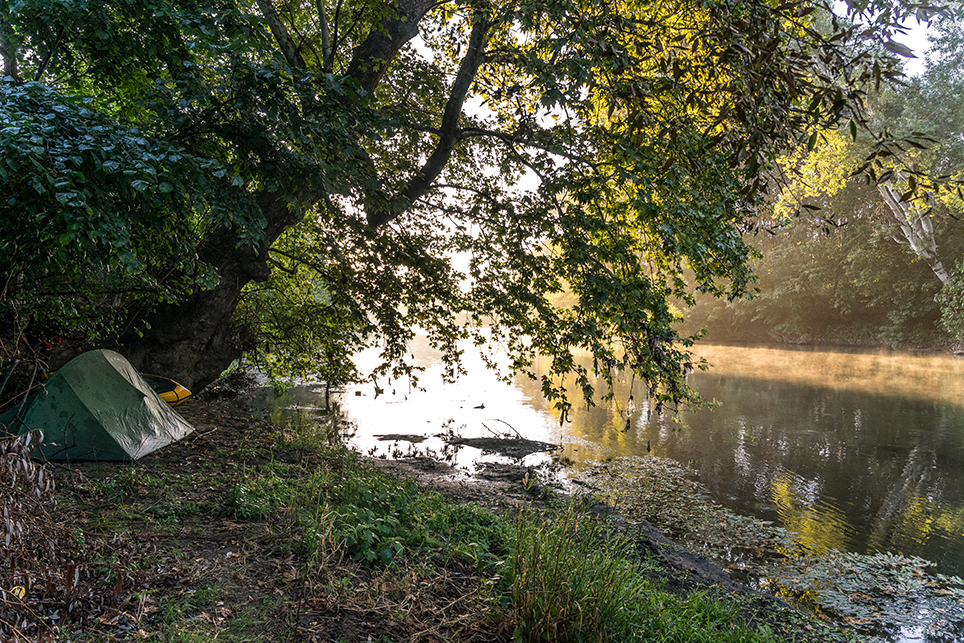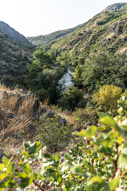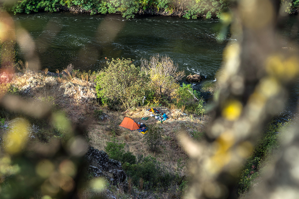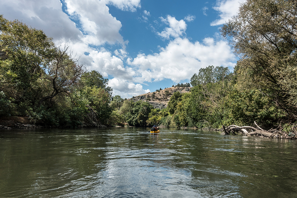 Doch die Ernüchterung folgt schnell. Der Vardar ist wunderschön – die Landschaft weit, warm und einladend –, und umso schmerzlicher trifft uns der Müll, der streckenweise an seinem Ufer liegt. Man verzweifelt fast, wenn man sieht, wie achtlos manche Menschen mit ihrem Land umgehen. Je weiter wir uns jedoch von Skopje entfernen, desto besser wird es; das Flusswasser trinken wir dennoch lieber nicht. Am Ende des ersten Tages erreichen wir den Beginn der Taor-Schlucht, in der der Fluss die Ausläufer des bis zu 2.500 Meter hohen Jakupica-Gebirges durchfließt. Die Dörfer weichen zurück, die Hügel rücken näher zusammen und der Fluss zieht kurvenreich durch das bewaldete Tal. Kleine Schwallstrecken machen das Paddeln lebendig, an einem Sandstrand bauen wir schließlich das Zelt auf – ein Ort, so friedlich und still, dass fast ein wenig Südsee-Feeling aufkommt.