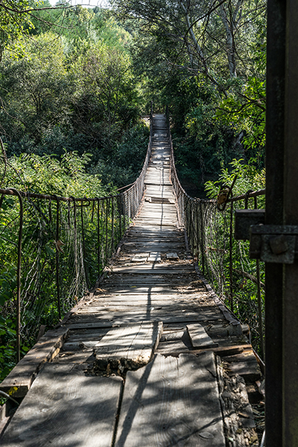 Auch am nächsten Morgen liegt der Himmel wolkenlos über uns, die Sonne glitzert auf dem Wasser, und erneut wechseln sich ruhige Passagen mit leichten Wildwasserstellen ab. Erstaunlich ist, wie stark der Pegel schwankt: Während unsere Feuerstelle noch beim Aufstehen deutlich über der Wasserlinie lag, schwappt bereits eine Stunde später das Wasser darüber – offenbar eine Regulierungsmaßnahme eines weiter flussaufwärts gelegenen Stausees. Am Nachmittag stoßen wir auf eine alte Hängebrücke, deren morsches Holz in Deutschland wohl keinen TÜV-Mitarbeiter eine Nacht schlafen ließe. Zögerlich betreten wir sie dennoch, balancieren vorsichtig hinüber und erreichen eine kleine orthodoxe Kapelle, verlassen und verschlossen, doch mit zwei klaren Quellen, die uns Wasser schenken. Wieder am Fluss, halten wir uns, wie empfohlen, strikt links, um den Ausstieg vor dem Tunnelkatarakt nicht zu verpassen. Zwischen Felsen können wir zwar problemlos anlanden, doch der Pfad hinauf ist überwuchert, dornig und nur mit Mühe zu begehen – dafür finden wir einen schönen Zeltplatz etwas weiter oberhalb. Das Tunnelkatarakt umtragen wir. Wir stehen lange am Hang, diskutieren, wägen ab. Von oben wirkt die Passage fahrbar, doch die großen Felsen und die wuchtigen Kehrwasser sind nicht zu unterschätzen und keiner von uns ist erpicht darauf, die Schwimmweste einem unfreiwilligen Praxistest zu unterziehen.