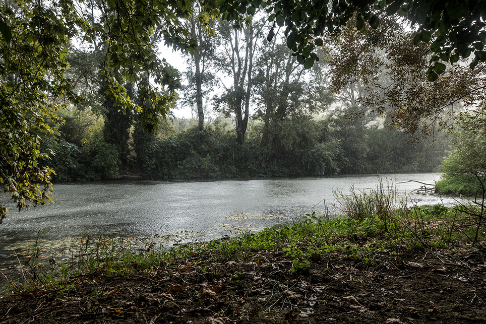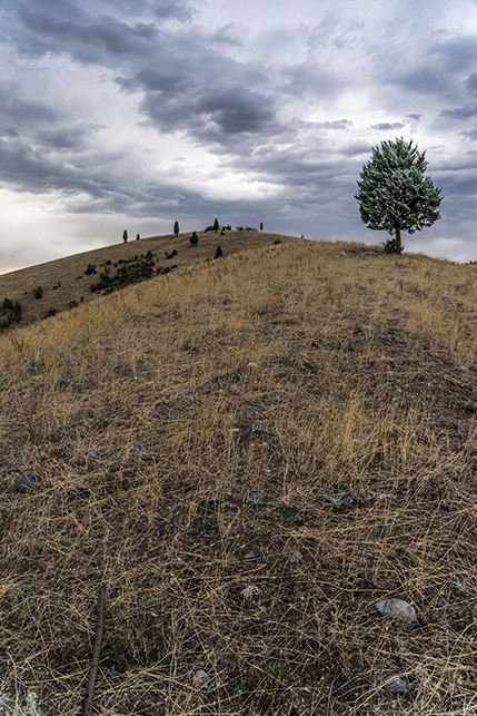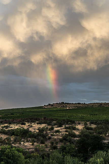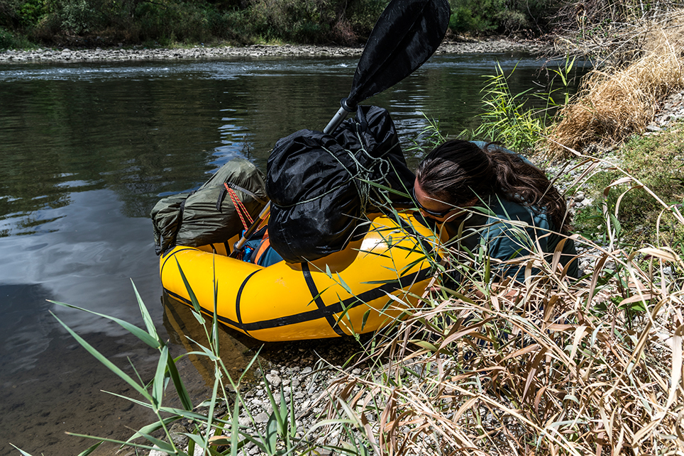 Gegen Mittag lassen wir die Taor-Schlucht hinter uns und erreichen Veles, eine Stadt mit fast 50.000 Einwohnern und mehreren Brücken, die den Fluss überspannen. Ich paddle voraus, Doreen folgt, doch kaum sind wir unter der ersten Brücke hindurch, ruft sie: „Irgendetwas ist kaputt gegangen!“ Sofort steuert sie eine Kiesbank an und wir blicken ungläubig auf einen zwanzig Zentimeter langen, messerscharfen Riss im Unterboden ihres Packrafts – sauber durchgeschnitten, sogar der Sitz ist betroffen. Wir haben keine Ahnung, was es gewesen sein könnte, sind jedoch vor allem erleichtert, dass ihr nichts passiert ist. Ausgerechnet an diesem Nachmittag hat sich der sonst so eintönig blaue Himmel zugezogen und das erste Donnergrollen rollen durch das Tal, während wir den Riss notdürftig mit Panzertape flicken. Die Konstruktion hält – erstaunlicherweise –, und wir verlassen Veles zwischen grauen Wohnblocks und verbauten Böschungen. Südlich der Stadt wird die Landschaft zunehmend mediterran: Die Wälder weichen gelbem Gras, helle Kalkfelsen setzen Akzente, und trotz des Gewitters, das uns noch erwischt, bleibt dieser Abschnitt einer der schönsten der gesamten Tour. Am Abend steigen wir auf eine Hügelkuppe, 200 Meter über dem Fluss, und blicken weit hinab in das weiter und sanfter werdende Tal des Vardar – ein Regenbogen krönt den Himmel.