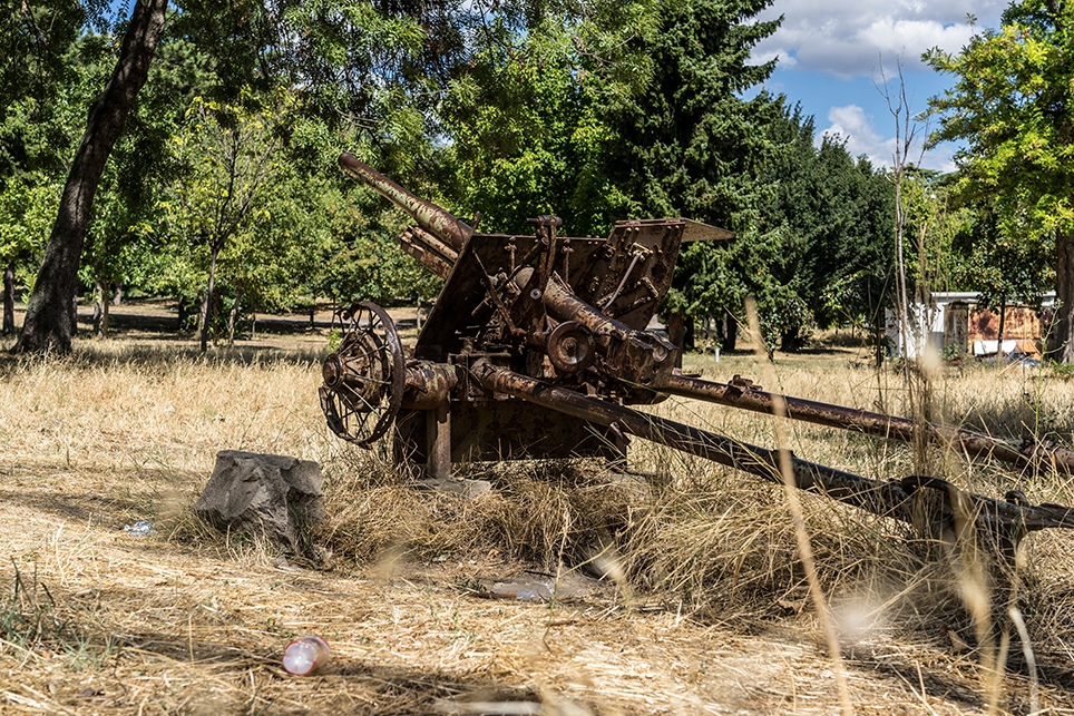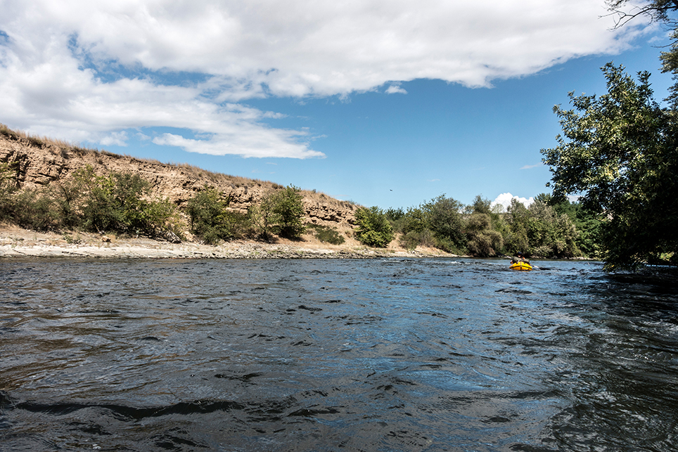 Vom Busbahnhof bringt uns ein beinahe leerer, vollständig von Graffiti bedeckter Zug nach Oreshani. Pünktlich rollt er an, doch kaum beginnen wir darüber zu witzeln, dass „in allen anderen Ländern funktioniert, was in Deutschland schief geht“, steht er auch schon mitten auf freier Strecke eine Viertelstunde still. Schließlich steigen wir auf einem improvisierten Acker aus und laufen durch das kleine Dorf zur Brücke über den Vardar. Hier erreichen wir endlich den eigentlichen Ausgangspunkt unserer Reise. Im Schatten der Brücke – inzwischen ist die Hitze des Tages über uns hereingebrochen – blasen wir die Packrafts auf, verstauen das Gepäck und zwängen uns in die Neoprenanzüge. Die Sorge der vergangenen Tage, der Fluss könne nach dem regenlosen Sommer kaum Wasser führen, erweist sich als unbegründet: Der Vardar hat einen nahezu idealen Pegel, das Bett ist voll, die Strömung kräftig, und so gleiten wir beschwingt in unser kleines viertägiges Abenteuer hinein.