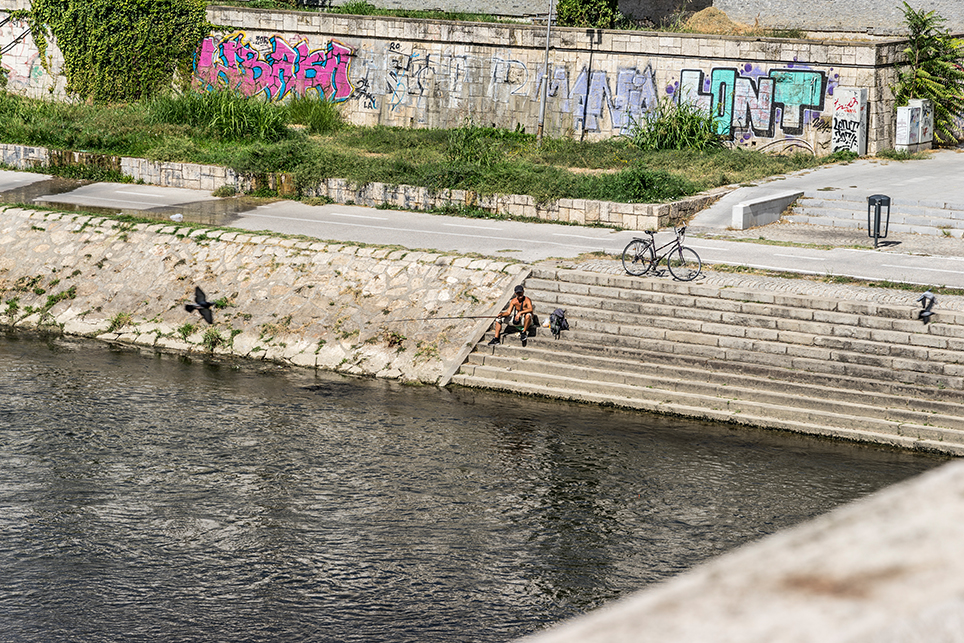 Griechische Landschildkröten streifen am Morgen um unser Zelt. Es ist Sonntag und am Fluss sitzen dutzende Angler, die uns meist freundlich grüßen, während wir vorbeipaddeln. Am letzten Tag wollten wir eigentlich bis Gradsko fahren, doch mit dem provisorisch reparierten Boot entscheiden wir uns für einen früheren Ausstieg in Nogaevtsi – immerhin hat dies den Vorteil, dass wir genug Zeit haben, um in Ruhe unsere Sachen zu trocknen. Der Bahnhof von Nogaevtsi erweist sich als nichts weiter als ein Trafohäuschen an einer eingleisigen Strecke. Mit uns wartet ein albanischer Hilfsarbeiter, dessen ganzes Hab und Gut in eine Plastiktüte passt. Der Zug kommt nicht. Die Bauern, die ihn hergebracht haben, fahren irgendwann wieder zurück. Es wird Abend, dann Nacht. Die Leuchten blinken auf, ein Zug taucht auf – aus der falschen Richtung. Dann Stille. Wir überlegen schon, ob wir uns zum Schlafen einfach auf den Bahnsteig legen sollen, als mit drei Stunden Verspätung endlich ein Personenzug aus der richtigen Richtung auftaucht. Wir springen hinein, fragen den erstbesten Passagier: „Skopje?“ Ein Nicken, „Da, Skopje.“ Der Schaffner erklärt uns später – über einen improvisierten Übersetzer –, dass niemand wisse, wann der Zug ankommen werde – irgendein Problem mit dem Motor – aber sie seien optimistisch, dass sie es irgendwie schaffen. Und das reicht. Im Wagen wird gelacht, erzählt, niemand ist genervt wegen der Verspätung. Auch das unterscheidet Nordmazedonien von Deutschland – dafür gibt es allerdings auch keine Anzeige und es ist schon blöd, wenn man nicht weiß, ob der Zug nun vielleicht in zehn Minuten kommt – oder an diesem Tag gar nicht mehr.