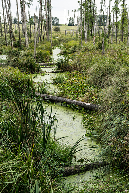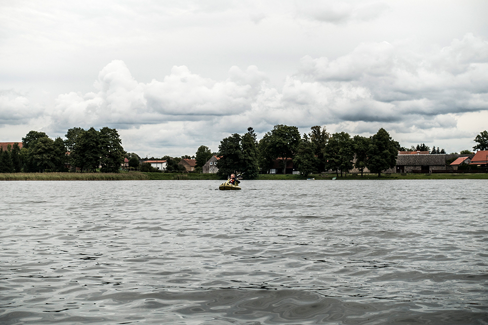 Tag 5: Nachdem wir am Vormittag gemeinsam über den langgezogenen Jezioro Harsz gepaddelt sind, bringt mich Jürgen nach Pozezdrze, von wo aus ich die folgenden drei Stunden über den Sapina nach Ogonki paddel. Das Wetter ist leider etwas wechselhaft und immer wieder ziehen Schauer durch. Nachdem ich es erst einmal geschafft habe, mein knallgelbes Packraft (O-Ton von zwei polnischen Fischern: „Yellow Submarine“) von der Brücke auf den Bach zu bekommen und einzusteigen, finde ich mich in solch dichtem Schilf wieder, dass mich ehrliche Zweifel überkommen, ob hier ein durchkommen ist. Aber irgendwo tut sich dann doch immer eine Lücke auf und als der Bach wenig später durch einen Wald fließt und das Schilf zurückbleibt, wird die Tour zu einem absolut entspannten dahin schippern und ich fühle mich im völligen Einklang mit der Natur. Zumindest solange bis ich den Jezioro Stręgiel erreiche und mich prompt mit starkem Gegenwind und einem sehr beeindruckenden Wellengang konfrontiert sehe. Sicherheitshalber ziehe ich die Schwimmweste über, dann stürze ich mich ins Getümmel und kämpfe gegen den Wind an, der mich partout wieder zurück in den Wald schieben will. Im Schneckentempo schaffe ich es dann aber doch nach Ogonki, wo Jürgen bereits auf mich wartet.
