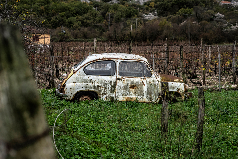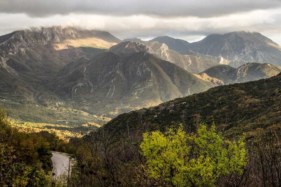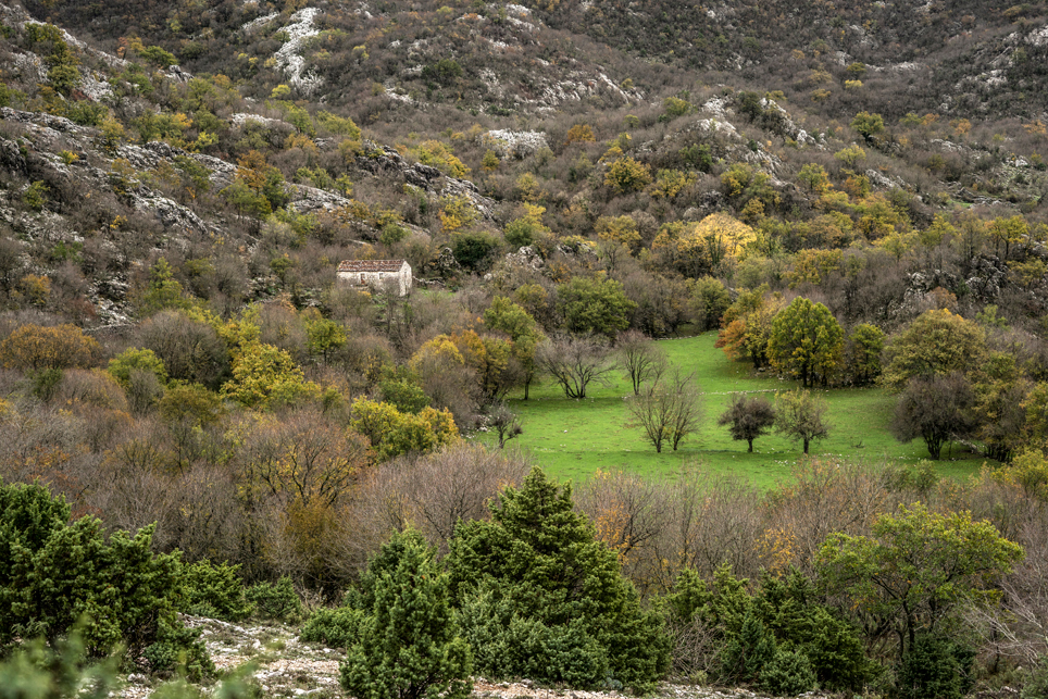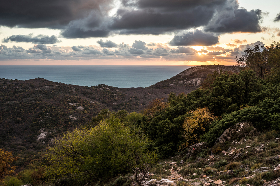 Am folgenden Tag wandere ich durch das wilde und menschenleere Kastgebirge Richtung Südosten. Das Wetter ist zum Glück etwas besser und nur gelegentlich schauert es. Verstreute Häuserruinen zeugen von einer früheren Besiedlung der Gegend – Stunden entfernt von der nächsten befahrbaren Straße. Pünktlich zum Sonnenuntergang erreiche ich einen Hügel und zum ersten Mal sehe ich meinen Zielort Bar. Ich zelte noch einmal auf einem Wiesensattel, bevor ich am folgenden Morgen die letzten Kilometer zum Meer absteige. Wie diffizil die Wasserversorgung im Karst ist, wird dort ein letztes Mal deutlich. Wenige Minuten vor meinem Zeltplatz komme ich an einem Bach vorbei, an dem ich Wasser zum Kochen abfülle. Als ich am nächsten Morgen nochmal neues Wasser holen möchte, ist der Bach bereits wieder ausgetrocknet.
