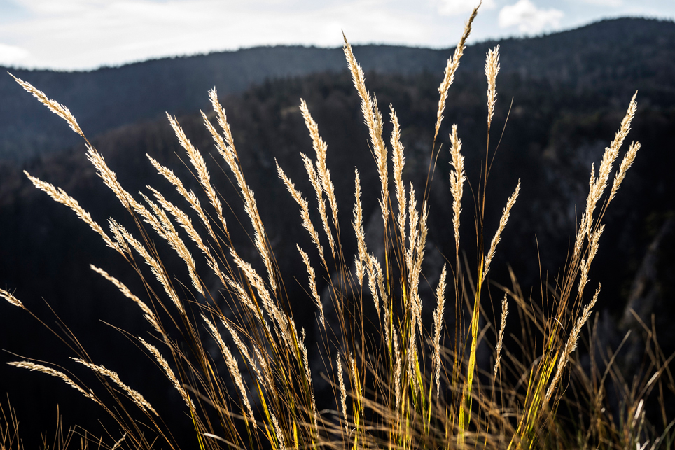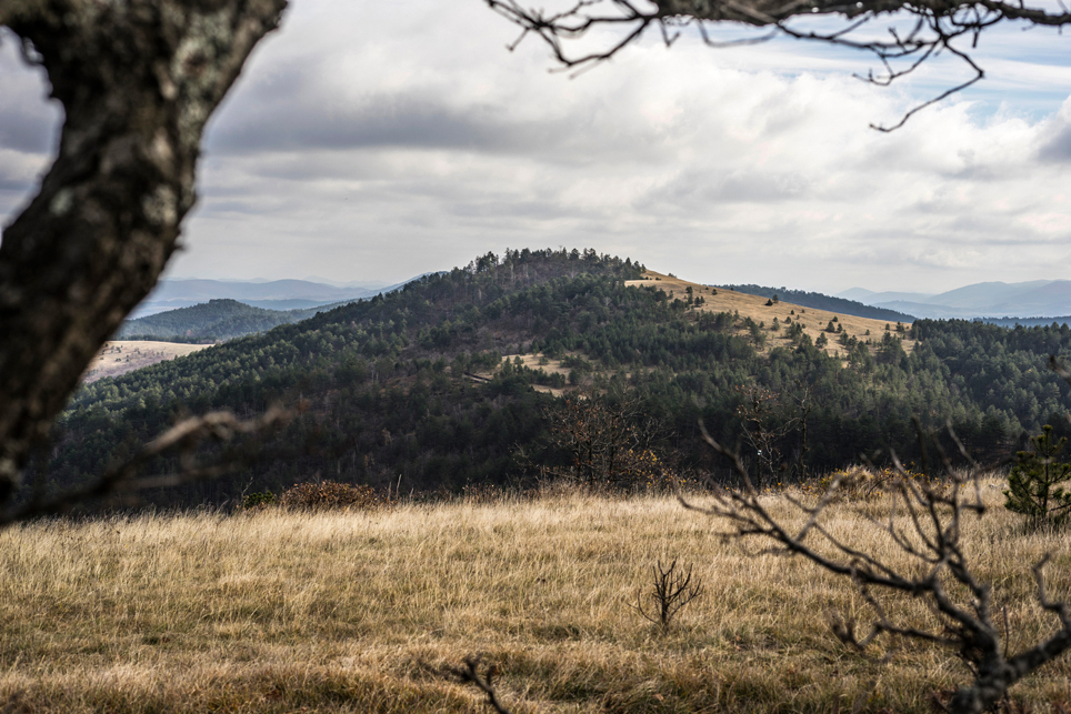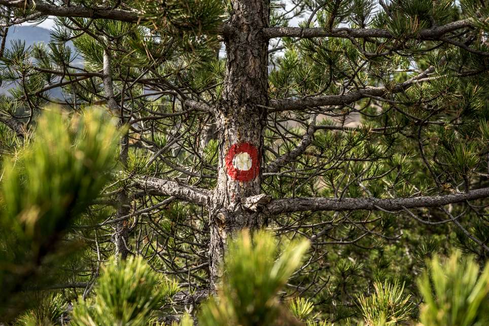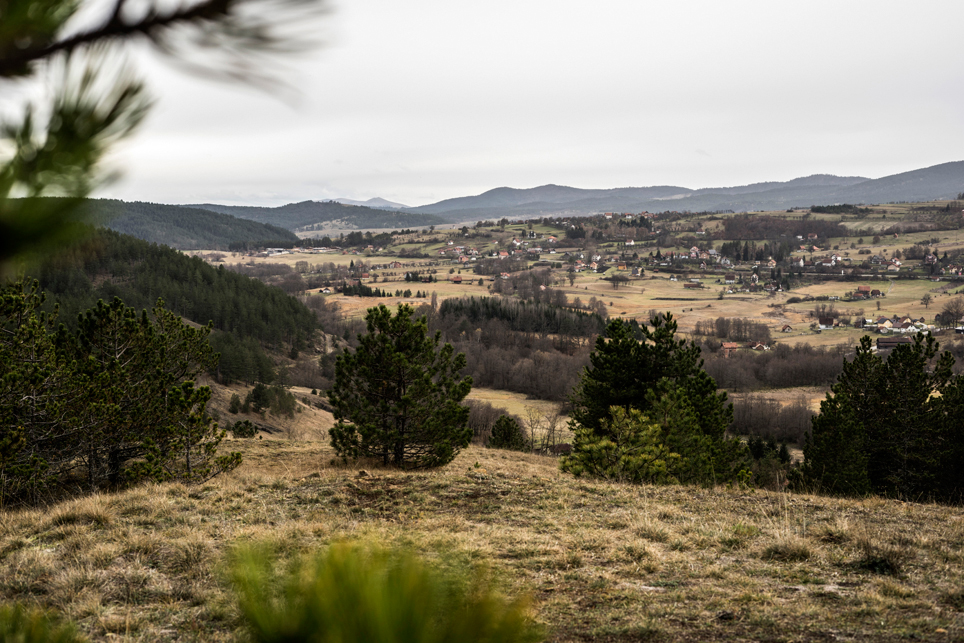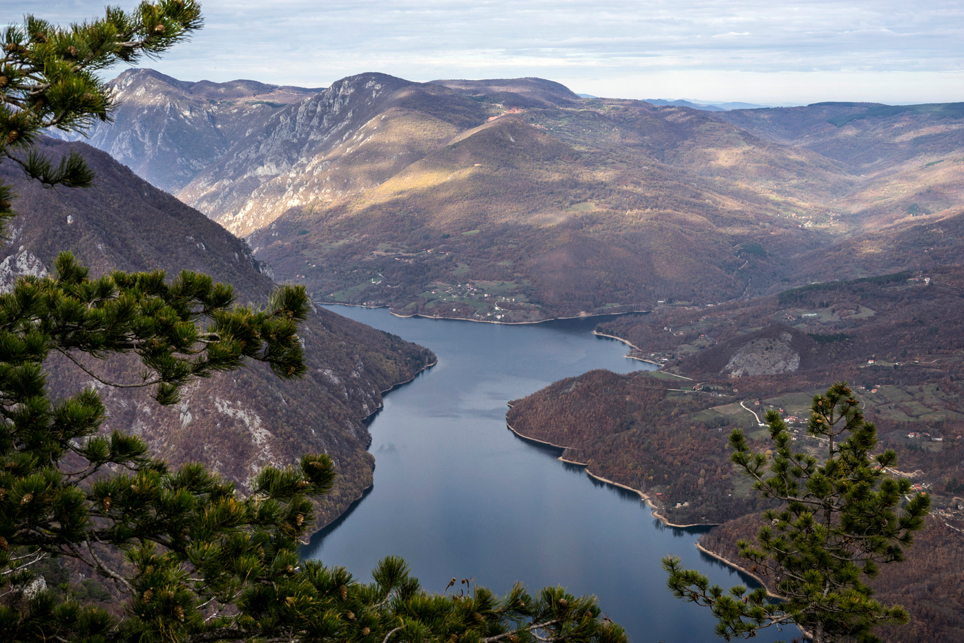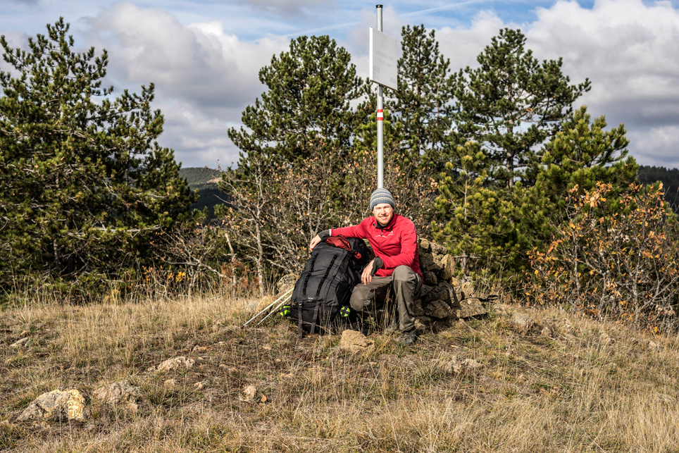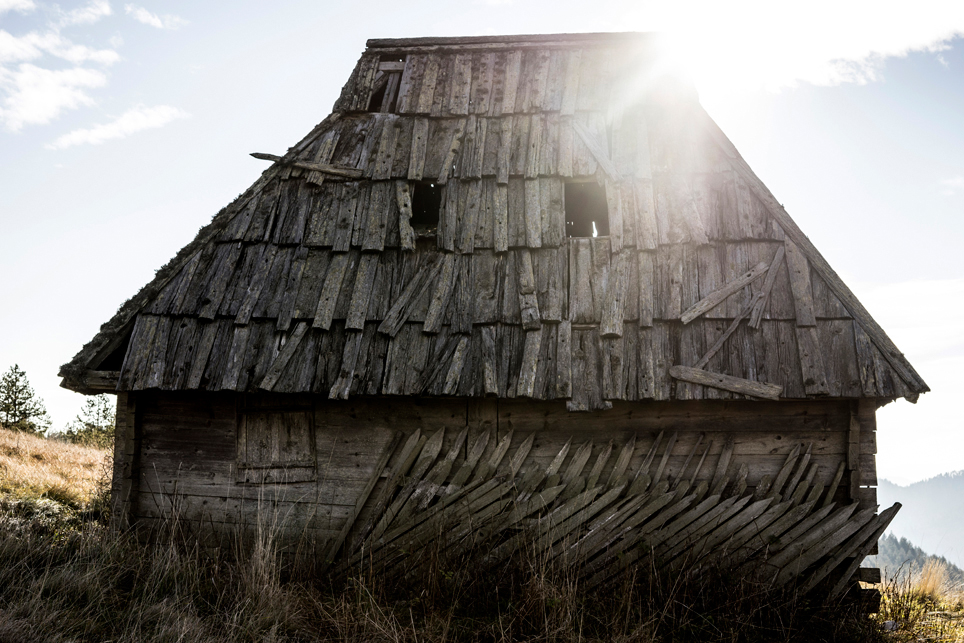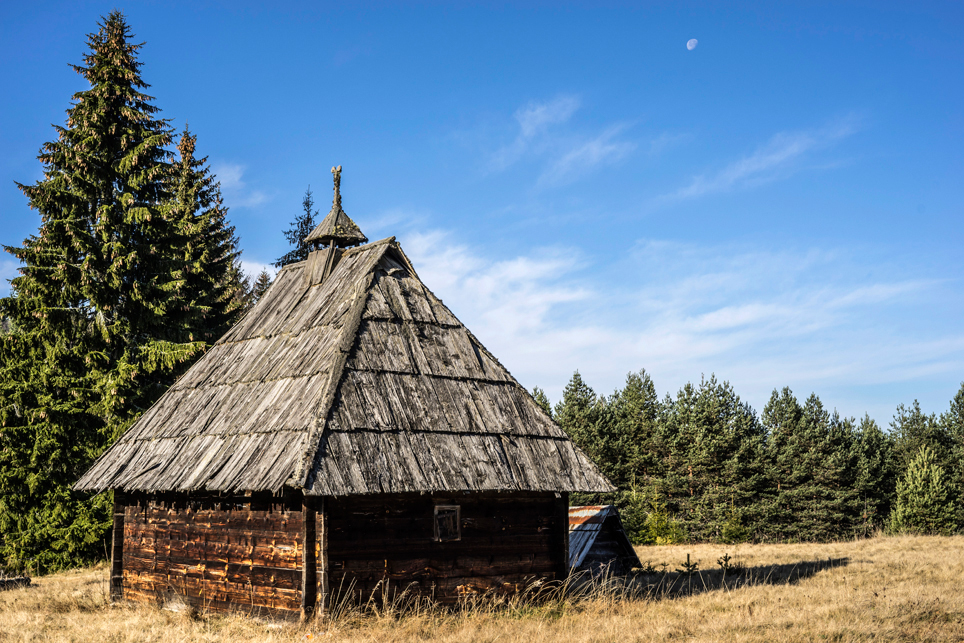 Zugtickets konnte ich im Vorfeld keine kaufen, aber ich habe zumindest einen groben Plan im Kopf. Ich möchte die Strecke Belgrad – Bar in vier Abschnitten befahren und dazwischen drei Mehrtagestouren in verschiedenen Nationalparks laufen. Der erste Teilabschnitt bringt mich in einer ziemlich modernen, aber leider völlig überfüllten Regiobahn bis in das kleine Dorf Branešci im Südwesten von Serbien. Ich schnüre meine Wanderschuhe und da es bereits spät am Abend ist, laufe ich sogleich los. Auf verstreute Häuser folgt ein Kiefernwald, dann erreiche ich die typischen baumfreien Höhen des Zlatibor. Wenn man von den halbwilden Pferden absieht, erinnert das Gebiet mit seinen weiten Fernblicken und sanften Hügeln an die Hochrhön. Nach anderthalb Tagen erreiche ich am Šarganpass die Grenze zum Taragebirge. Die Region ist sehr trocken und seit meiner Abreise in Belgrad konnte ich kein Wasser mehr auffüllen – ein Problem, das mich zu einem längeren, ungeplanten Abstieg nötigt und das ich so nicht auf dem Schirm hatte. Ich plane etwas um und richte meine Wanderung stärker an den Quellen und wenigen Bächen aus. Auch das Taragebirge besteht zu großen Teilen aus einsamen Hochflächen, die in ihrer Kleinräumigkeit einen wahren Augenschmaus darstellen. Waldflächen wechseln sich ab mit herbstgelben Wiesen, auf denen verstreute Holzhäuschen stehen. Mal liebevoll renoviert, mal völlig verfallen und gerade in der Dämmerung fast schon unheimlich wirkend.