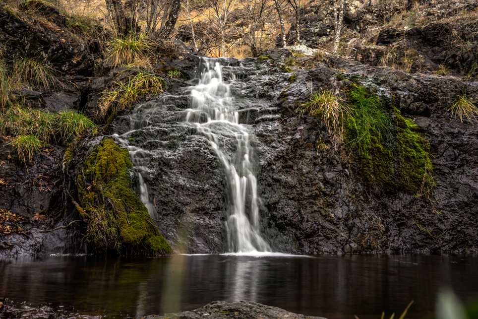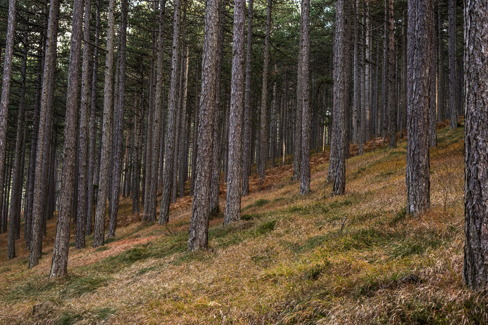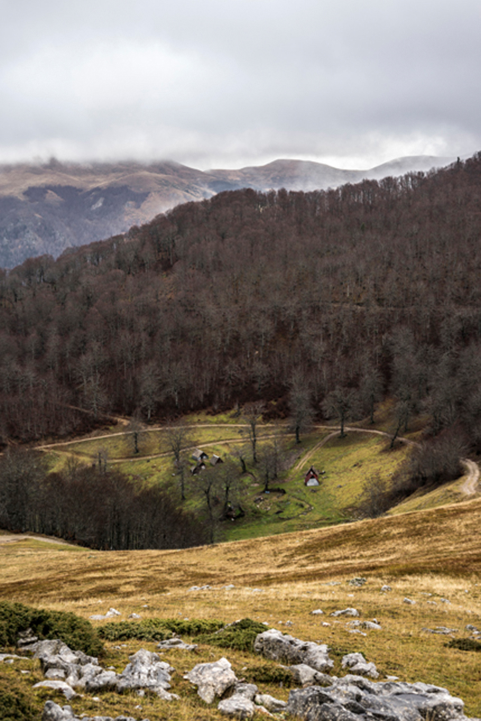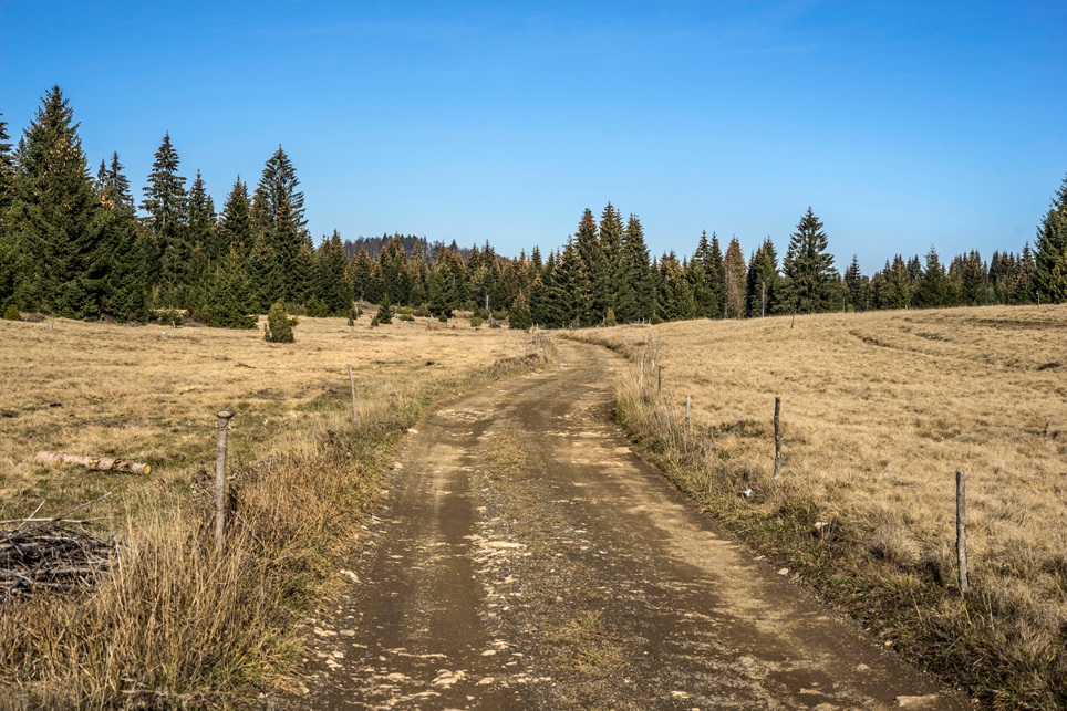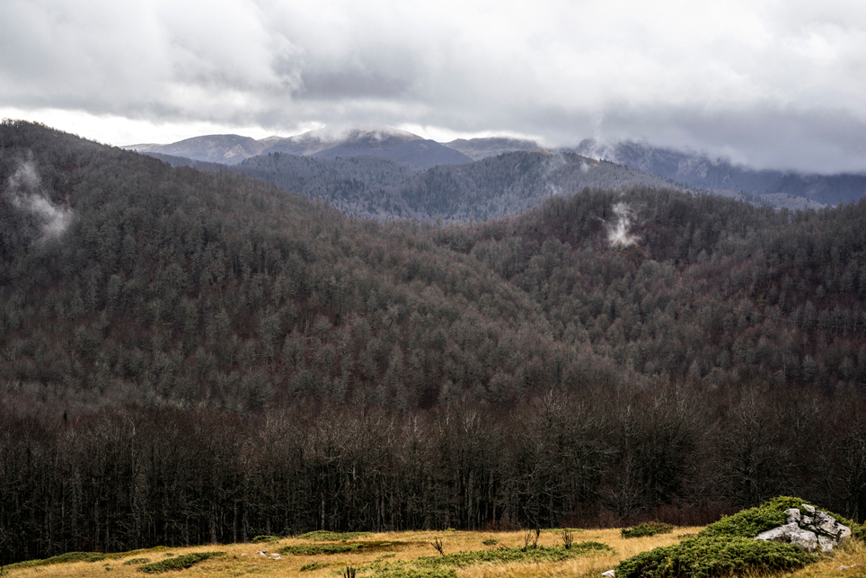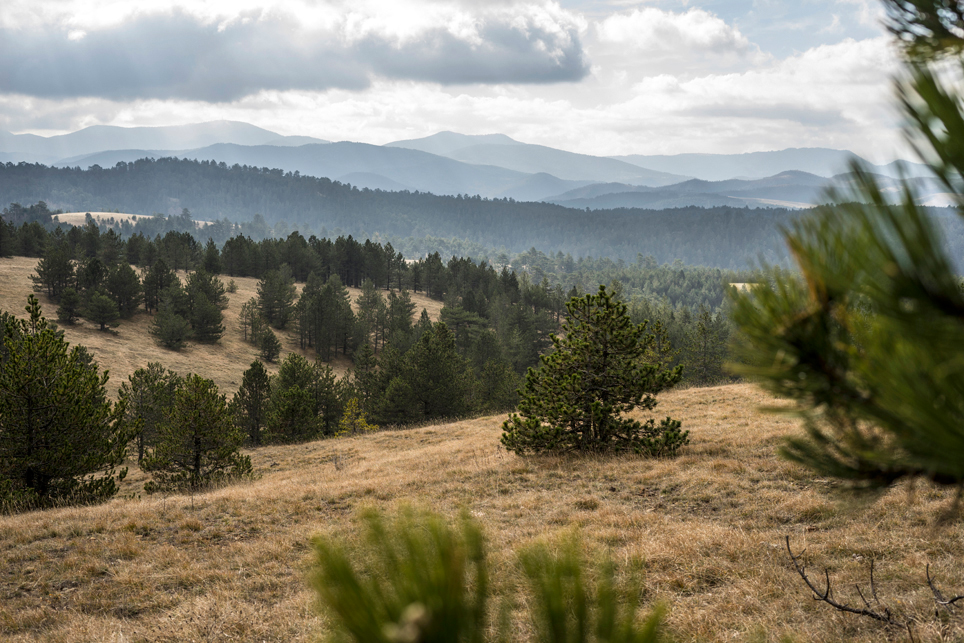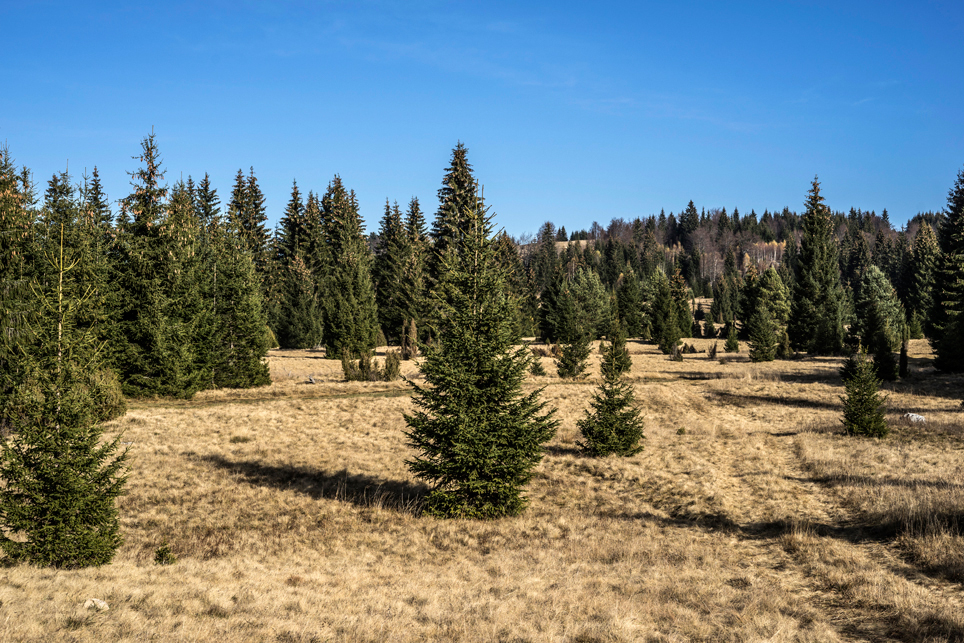 Zugtickets konnte ich im Vorfeld keine kaufen, aber ich habe zumindest einen groben Plan im Kopf. Ich möchte die Strecke Belgrad – Bar in vier Abschnitten befahren und dazwischen drei Mehrtagestouren in verschiedenen Nationalparks laufen. Der erste Teilabschnitt bringt mich in einer ziemlich modernen, aber leider völlig überfüllten Regiobahn bis in das kleine Dorf Branešci im Südwesten von Serbien. Ich schnüre meine Wanderschuhe und da es bereits spät am Abend ist, laufe ich sogleich los. Auf verstreute Häuser folgt ein Kiefernwald, dann erreiche ich die typischen baumfreien Höhen des Zlatibor. Wenn man von den halbwilden Pferden absieht, erinnert das Gebiet mit seinen weiten Fernblicken und sanften Hügeln an die Hochrhön. Nach anderthalb Tagen erreiche ich am Šarganpass die Grenze zum Taragebirge. Die Region ist sehr trocken und seit meiner Abreise in Belgrad konnte ich kein Wasser mehr auffüllen – ein Problem, das mich zu einem längeren, ungeplanten Abstieg nötigt und das ich so nicht auf dem Schirm hatte. Ich plane etwas um und richte meine Wanderung stärker an den Quellen und wenigen Bächen aus. Auch das Taragebirge besteht zu großen Teilen aus einsamen Hochflächen, die in ihrer Kleinräumigkeit einen wahren Augenschmaus darstellen. Waldflächen wechseln sich ab mit herbstgelben Wiesen, auf denen verstreute Holzhäuschen stehen. Mal liebevoll renoviert, mal völlig verfallen und gerade in der Dämmerung fast schon unheimlich wirkend.