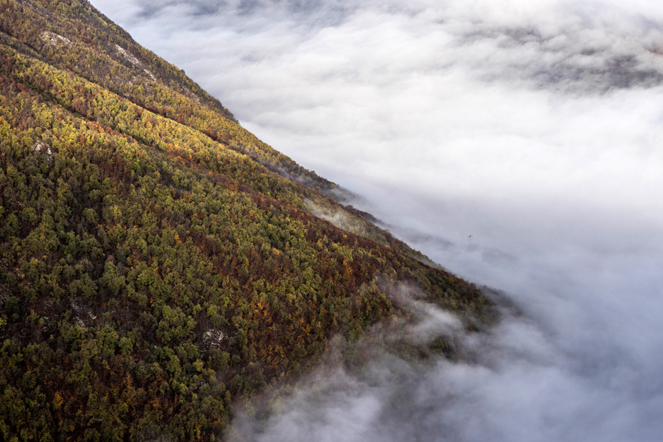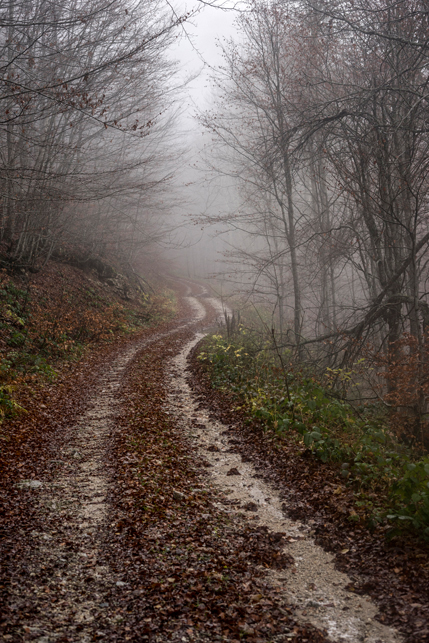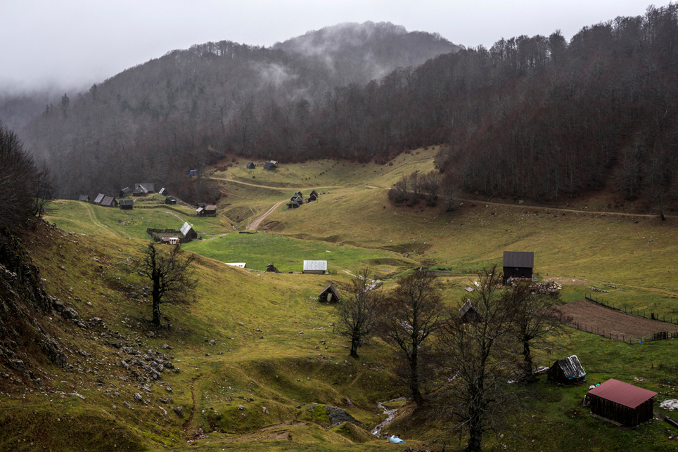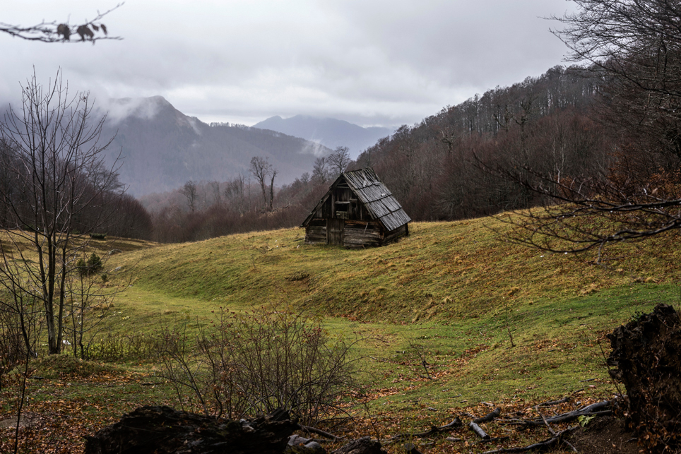 Beim nächsten Versuch bin ich richtig und setze einen ersten Fuß auf montenegrinischen Boden. Bisher hätte das Wetter nicht besser sein können. Viel Sonne und milde Temperaturen. T-Shirt-Wetter mitten im November. Zehn Minuten später ziehe ich meine Regenjacke an. Mein zweiter Wanderabschnitt führt mich durch den Biogradska Gora Nationalpark. Das 56 Quadratkilometer große Gebiet wurde 1952 unter Schutz gestellt und besteht zum Wesentlichen aus unberührtem Bergwald, der sich rund um den zentralen, namensgebenden See erstreckt. Mit seinen 500 Jahre alten und bis zu 45 Meter hohen Bäumen gilt er als einer der ganz wenigen urzeitlichen Wälder Europas. Leider trübt der immer stärker werdende Regen bei ungemütlichen 6°C das Naturerlebnis gewaltig. Wie schön wäre es nur einen Tag früher gewesen, im Sonnenschein am See zu sitzen und der Stille zu lauschen. Doch das Wetter ist nicht zu ändern und so kämpfe ich mich bei Starkregen und Gewitter die 700 Höhenmeter zur Almsiedlung von Katun Goleš empor. Als ich die verstreuten Hütten erreiche, bin ich völlig durchnässt. Sturzbäche an schäumendem, braunen Wasser schießen über die sonst so sanften Almwiesen. Der Gedanke, bei diesen Bedingungen das Zelt aufzubauen, deprimiert mich und so laufe ich auf gut Glück zu den Hütten. Nach ein paar Fehlversuchen habe ich tatsächlich Glück und eine alte Hütte, die eher als Rumpelkammer zu dienen scheint, ist offen. Und wieder einmal zeigt sich, wie wenig es manchmal braucht, um glücklich zu sein – einfach nur ein trockenes und windgeschütztes Fleckchen inmitten der lebensfeindlichen Naturgewalten.