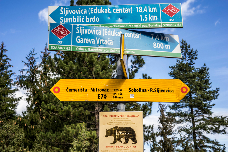 Aber natürlich gibt es auch sehr schöne Bereiche. Vor allem im Norden darf ich mehrere spektakuläre Ausblicke bewundern. Erst auf die tief unter mir dahinfließende Drina, den Grenzfluss zu Bosnien und anschließend in die wilde, von Braunbären bevölkerte Rača-Schlucht. Insgesamt 60 Exemplare von Meister Petz sollen durch den gesamten Park streifen. Begegnungen sind allerdings selten und auch ich sehe lediglich Losung und ganz am Ende meiner Wanderung einmal Tatzenabdrücke auf einem matschigen Waldweg.