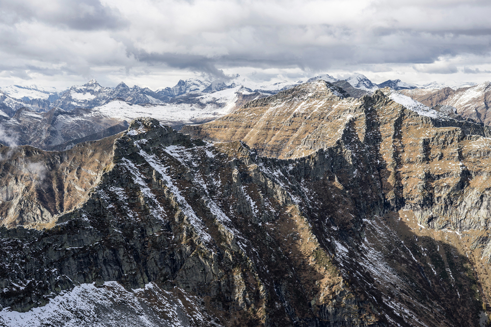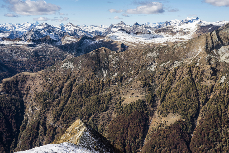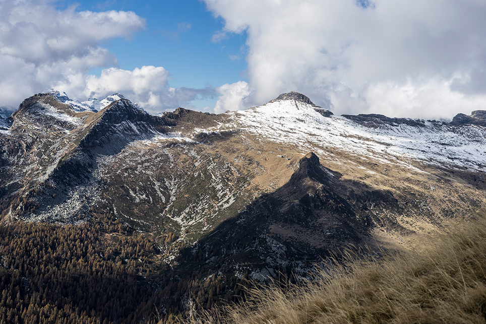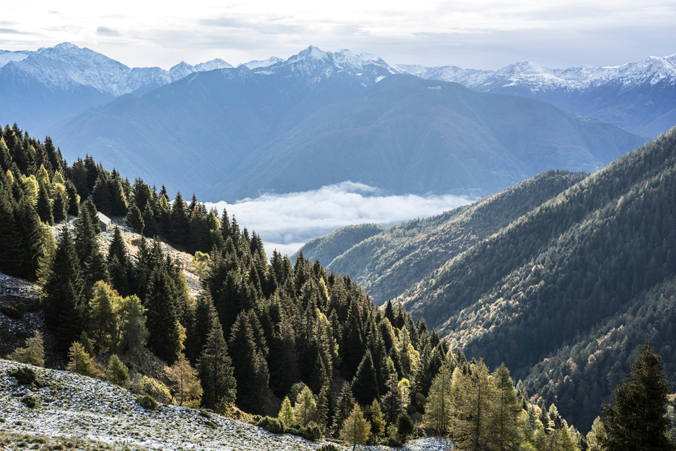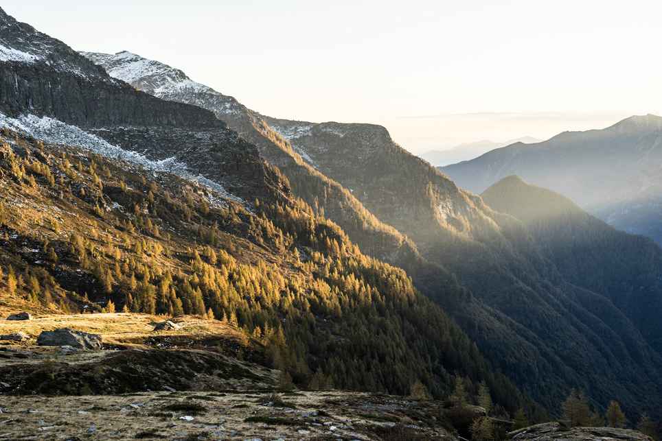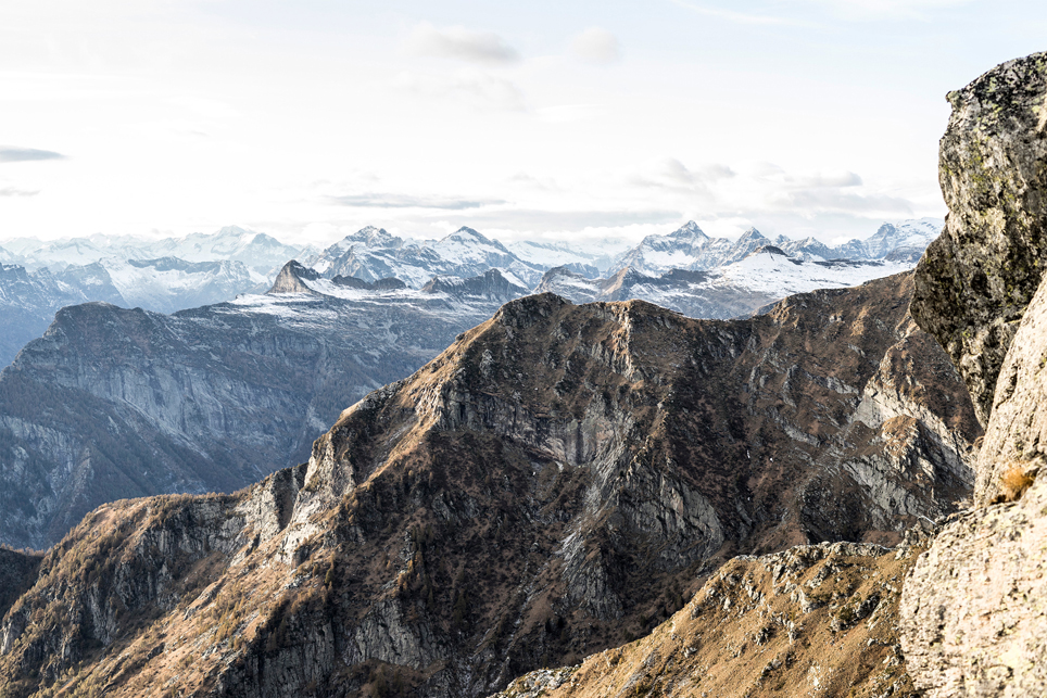 Als Mitte Oktober bereits der zweite Wintereinbruch den Herbst für ein paar Tage vertreibt und die umliegenden Berge bis weit hinunter in ein weißes Kleid hüllt, beschließe ich der Alpensüdseite einen Besuch abzustatten. Abgesehen von meinem Anreisetag ist das Wetter für die Region um den Lago Maggiore sehr gut vorhergesagt - ein Mix aus Sonne und Wolken, bis zu 18 Grad und vor allem kein Niederschlag. Das hört sich wirklich vielversprechend an. Während ich im Fernbus von München nach Arbedo-Castione sitze und wir durch das wolkenverhangene Rheintal fahren, sehe ich mich bereits durch goldgelben Lärchenwald wandern, über ausgesetzte Felsgrate balancieren und auf sonnenbeschienenen Berggipfeln eine Pause einlegen.