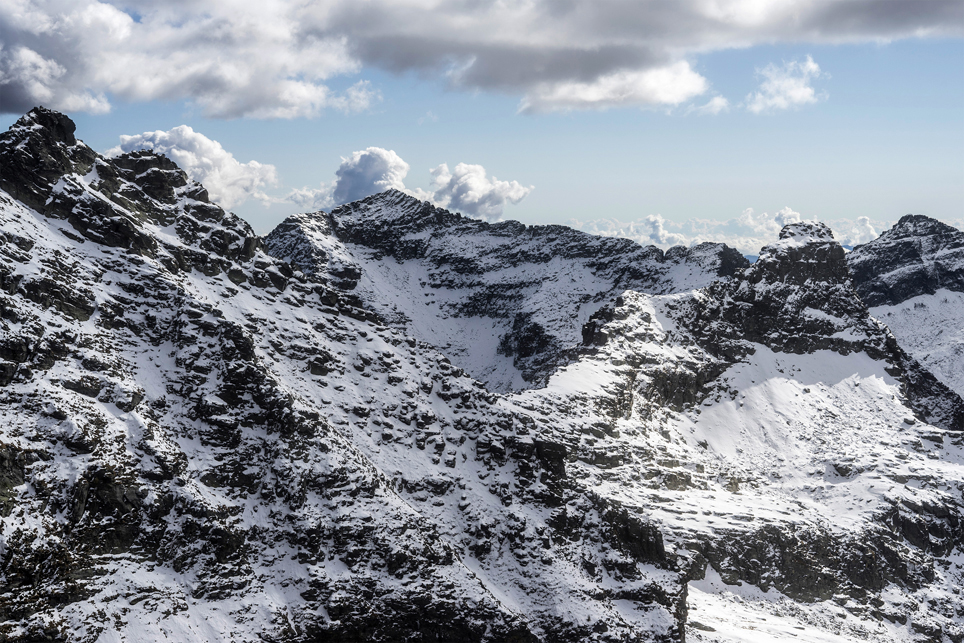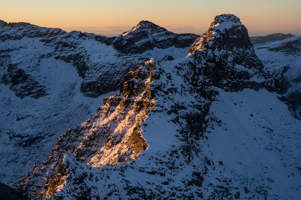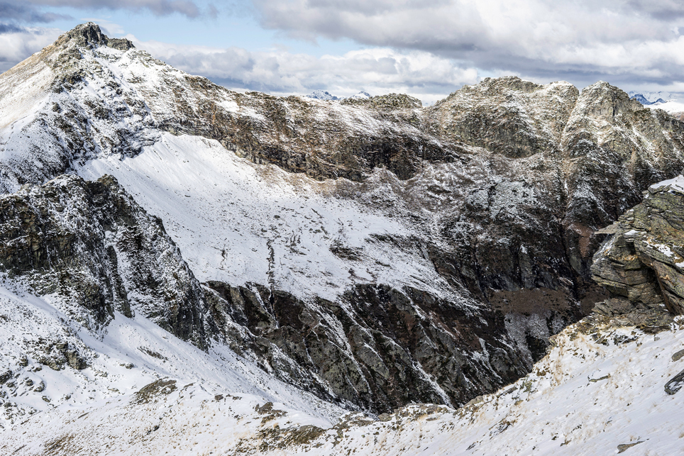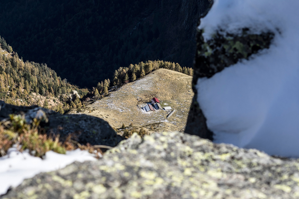 Gegen 6 Uhr taucht die aufgehende Sonne die ersten Gipfel in ein warmes, orangenes Licht. Ich betrachte das Naturschauspiel, doch bis ich selbst die ersten Sonnenstrahlen auf meinem Gesicht spüre, dauert es noch drei geschlagene Stunden. Still und friedlich liegt die Bergwelt an diesem Morgen zu meinen Füßen, dennoch kann ich es nicht uneingeschränkt genießen, denn die Unsicherheit des bevorstehenden Weiterwegs lastet auf mir. Nachdem meine Schuhe wieder aufgetaut sind und ich einen Riegel gefrühstückt habe, packe ich mein Biwak zusammen, schultere den schweren Rucksack und breche auf. Die Westflanke, die ich nun direkt queren muss, stellt sich als ebenso steil und ausgesetzt heraus, wie der erste Eindruck im Dunkel der Nacht hat vermuten lassen. Vorsichtig prüfe ich jeden Schritt. Immer darauf bedacht, einen guten Stand zu haben und nicht plötzlich auf dem plattigen Fels abzurutschen. Schließlich erreiche ich einen schmalen, teilweise schneefreien Grat, der äußerst ausgesetzt zu einer Scharte leitet. Immer wieder gilt es kurze, senkrechte Stufen abzuklettern. Der vom Schmelzwasser nasse Fels ist extrem rutschig und bedarf großer Vorsicht. Nach dem Grat leiten die Markierungen in einen fast weglosen Steilhang aus Gras und Schrofen. Doch dieser Hang ist meist südseitig ausgerichtet, weitestgehend schneefrei und ermöglicht mir ein fast schon genussvolles Queren an dicken Grasbüscheln. Dennoch dauert die Querung noch einmal eine halbe Ewigkeit. Dann habe ich auch diese Passage hinter mir und endlich sehe ich die Capanna Cornavòsa auf einem flachen, schneebedeckten Plateau 350 Meter unter mir liegen.