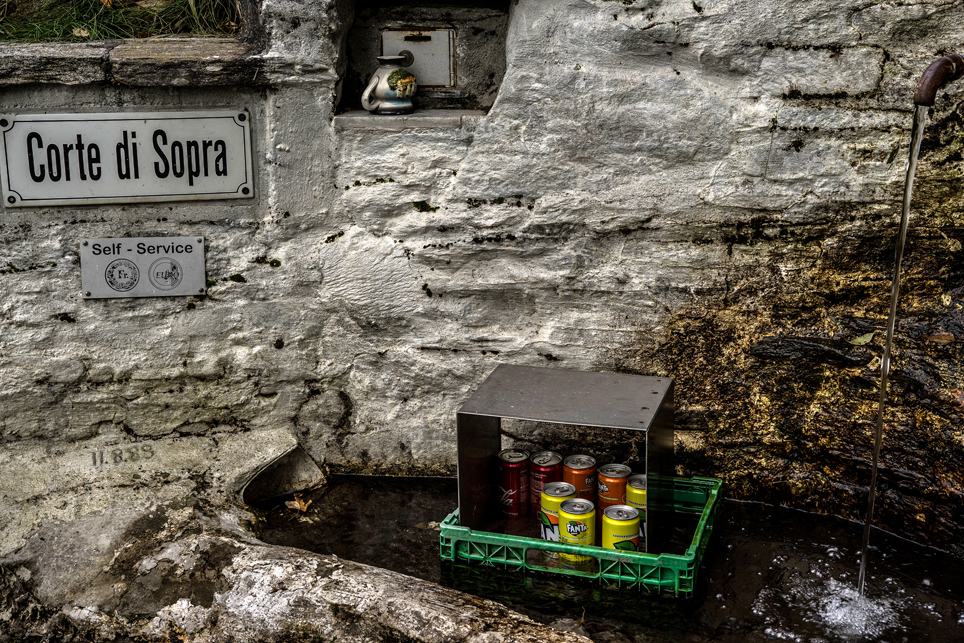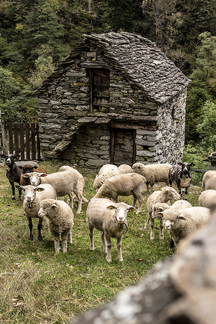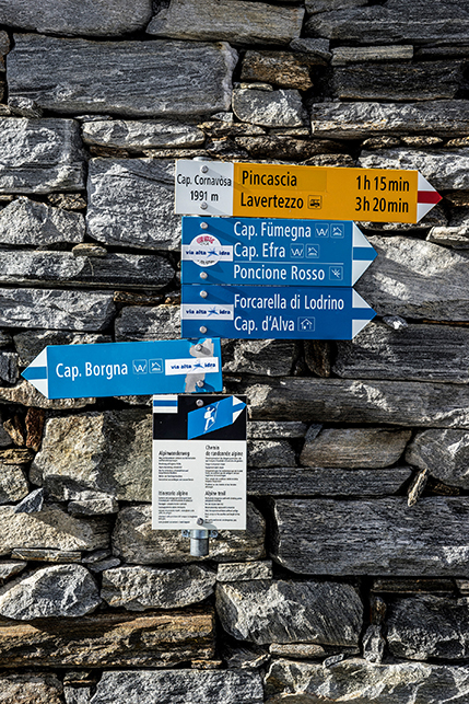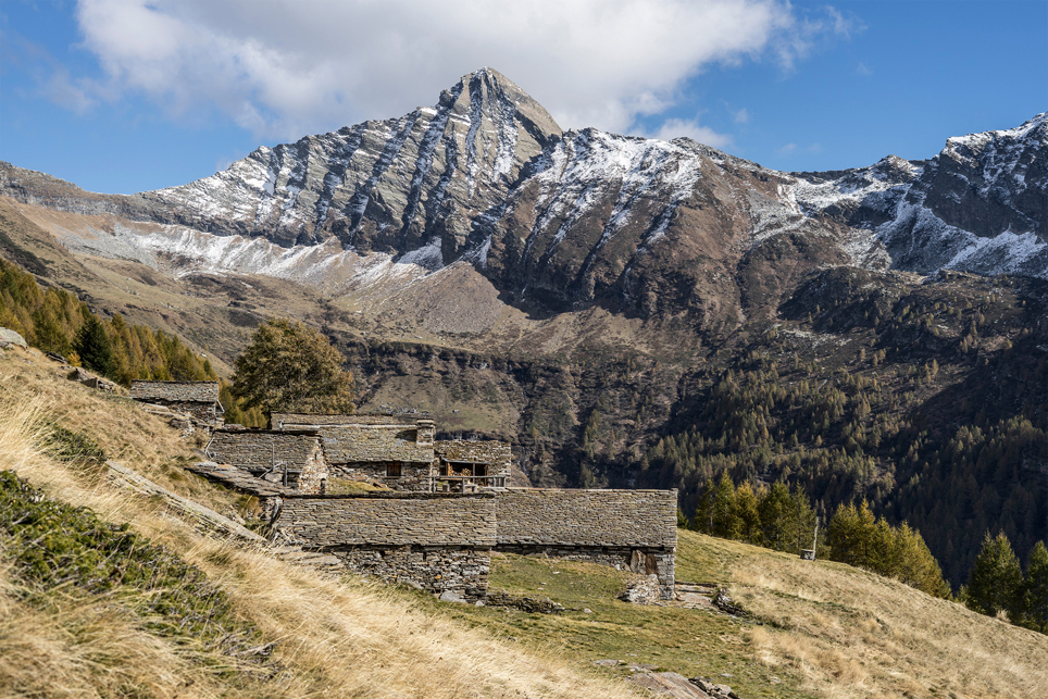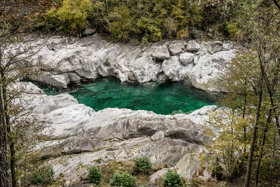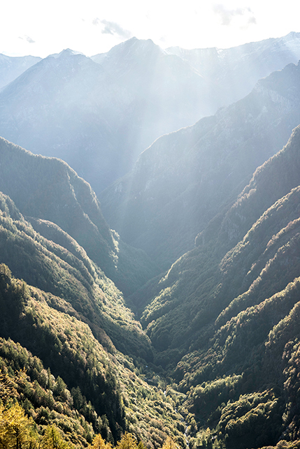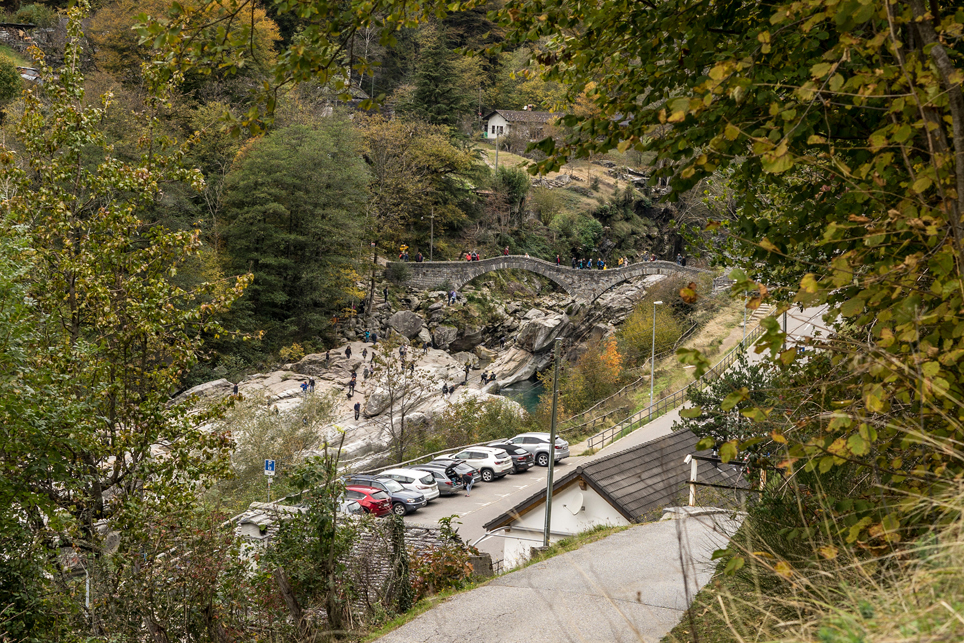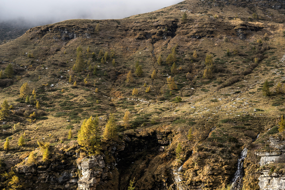 Eine halbe Stunde später sitze ich auf einer Bank vor der Hütte in der Sonne und trinke eine Cola. Ich gehe völlig in dem Moment auf, genieße und bin einfach nur froh, endlich die Hütte erreicht zu haben. Bei den Bedingungen hätte ich das niemals an einem Tag geschafft. Eine ganze Weile sitze ich so da, dann breche ich auf, um noch eine Stunde zum Hochtal oberhalb der Fürmegna-Hütte zu wandern. Der Weg ist weitestgehend schneefrei und problemlos zu begehen. Oberhalb eines kleinen Bachs baue ich mein Zelt auf und kuschel mich in meinen Schlafsack. Am nächsten Morgen sind es – 7 Grad Celsius. Meine Schuhe, die ich vor dem Zelt stehen hatte, sind absolut steif gefroren und es dauert sicherlich zehn Minuten, bis ich endlich meine Füße hineingezwängt habe. Ich starte noch einmal einen kurzen Versuch auf der Via Alta, doch schon der erste Steilhang ist völlig vereist und da ein Ausrutschen auch hier wieder ernsthafte Folgen mit sich führen würde, entscheide ich mich dazu mein Vorhaben abzubrechen. Stattdessen wandere ich über einen schönen, sonnenbeschienenen und schneefreien Pfad auf den 2.173 Meter hohen Matarello. Ein zwar unscheinbarer Berg, der dafür aber mit einer tollen Aussicht gesegnet ist. Den Abend möchte ich auf der Capanna Fürmegna verbringen, doch wieder habe ich Pech, denn genau diese Hütte ist nicht mehr offen und ich stehe somit vor verschlossener Tür. Also steige ich noch weiter ab und zelte schließlich in einem kleinen, von Wasserfällen umgebenen Tal, das mich ein bisschen an Bruchtal aus „Der Herr der Ringe” erinnert. Es ist wirklich sehr schön, allerdings benötigt man zwingend Ohropax zum Schlafen. Am folgenden Morgen steige ich weiter durch das Tal ab und schon bald bereue ich meine Entscheidung, die Tour abzubrechen, überhaupt nicht mehr. Dafür ist die Landschaft einfach zu schön. Das Laub der Bäume erstrahlt in den buntesten Herbstfarben und immer wieder stürzen Wasserfälle über steile Felswände hinab. Ich durchquere mehrere verlassene Almsiedlungen, deren rustikale Steinhäuser und die gepflasterten, engen Gassen wie aus der Zeit gefallen wirken. Halbwilde Schafherden streunen zwischen den kleinen Häusern umher und versuchen mir zu folgen. Schließlich öffnet sich das Tal und ich blicke auf das kleine Dorf Lavertezzo am Verzasca-Fluss hinab. Der Wanderweg führt nur wenige Meter oberhalb des Flusses entlang und immer wieder fällt mein Blick auf das türkisfarbene Wasser, das zwischen den weißen Gneisfelsen dahinfließt. Am Stausee des Lago di Vogorno wechsel ich über eine hohe Brücke auf die gegenüberliegende Seite und es bietet sich ein ganz erstaunliches Bild. Während links von mir das glasklare Wasser der Verzasca dahinfließt, ist das gesamte Flussbett rechts von mir von hunderten und aberhunderten von Baumstämmen und weiterem Treibholz verdeckt, dass sich hier staut und ein eindrückliches Zeugnis der katastrophalen Regenfälle abliefert, die das Tessin Anfang Oktober heimgesucht haben.