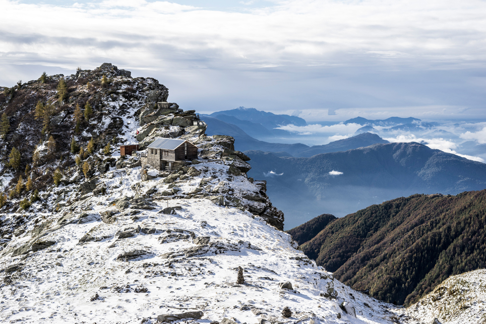 Am San Bernadino Pass werde ich allerdings erst einmal in die Wirklichkeit zurückgeholt, denn der stetige Regen geht langsam aber sicher in einen weißen Flockenwirbel über und die Passhöhe ziert eine erste kleine Herbstschneedecke. Von dort aus geht es noch 45 Kilometer sanft bergab bis ins Tal des Ticino, doch der Schnee auf den umliegenden Bergen hält sich hartnäckig. Als ich den Bus verlasse, ist es bereits 18 Uhr und ich habe noch 1.600 Höhenmeter Aufstieg bis zur ersten Selbstversorgerhütte vor mir. Sicherheitshalber habe ich zwar auch ein kleines Zelt dabei, es stört mich dann aber trotzdem, als ich nach einer halben Stunde merke, dass ich genau in die falsche Richtung gelaufen bin. Ich schiebe die anfänglichen Orientierungsprobleme auf den Kreisel, durch den der Bus direkt vor der Haltestelle gefahren ist und muss wohl oder übel die Strecke wieder zurücklaufen. Beim zweiten Versuch klappt es und nachdem ich mich mit einem Dürüm für sage und schreibe neun Franken gestärkt habe, folge ich den Wanderwegweisern durch die dicht besiedelte Talsohle. Als ich das letzte Dorf hinter mir lasse und endlich der eigentliche Aufstieg zur Hütte beginnt, ist es bereits tiefste Nacht und ich bin mit dem Schein meiner Stirnlampe alleine. So richtig gut komme ich nicht voran. Der Weg ist zwar nicht steil, doch immer wieder sorgen umgestürzte Bäume, die scheinbar einem kürzlichen Herbststurm zum Opfer gefallen sind, für unfreiwillige Klettereinlagen. Auch die Wolken halten sich hartnäckig und immer wieder gibt es kurze Regenschauer. Um halb zwölf habe ich keine Lust mehr und baue mein Zelt knapp 300 Höhenmeter unterhalb der Hütte auf einer verlassenen Almwiese auf.