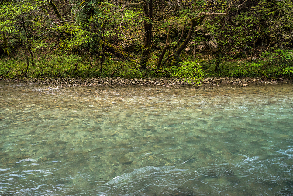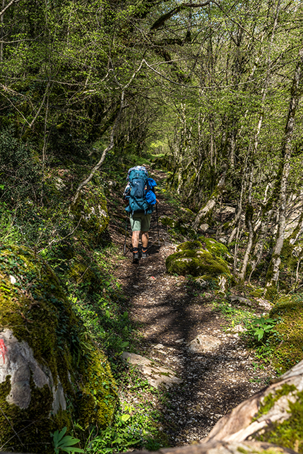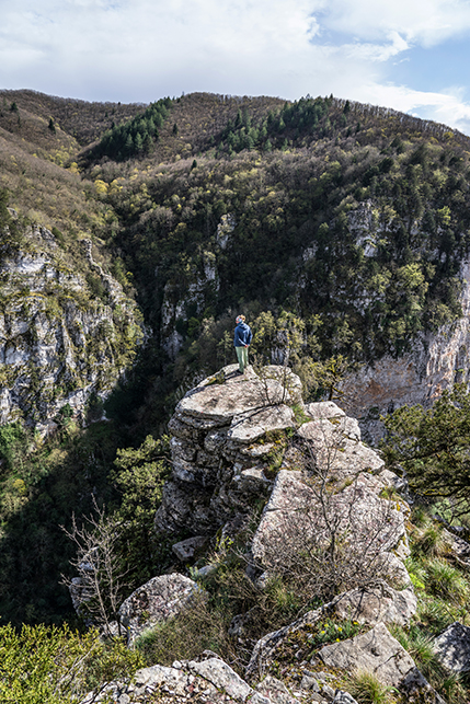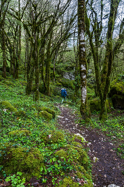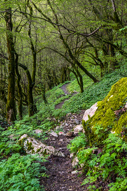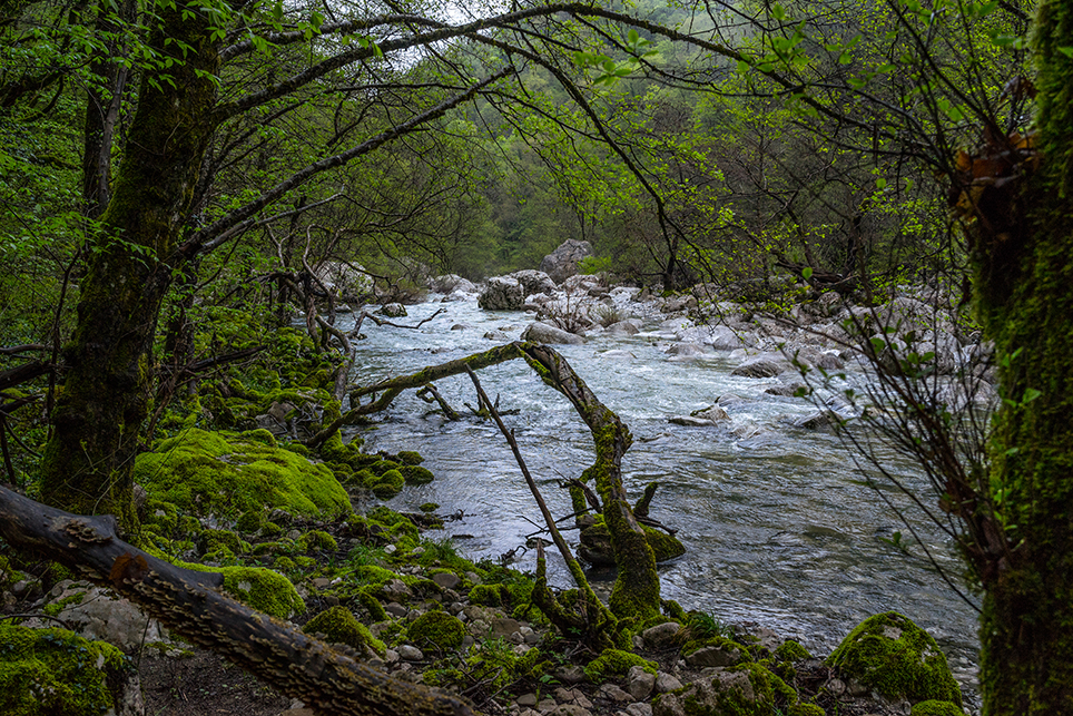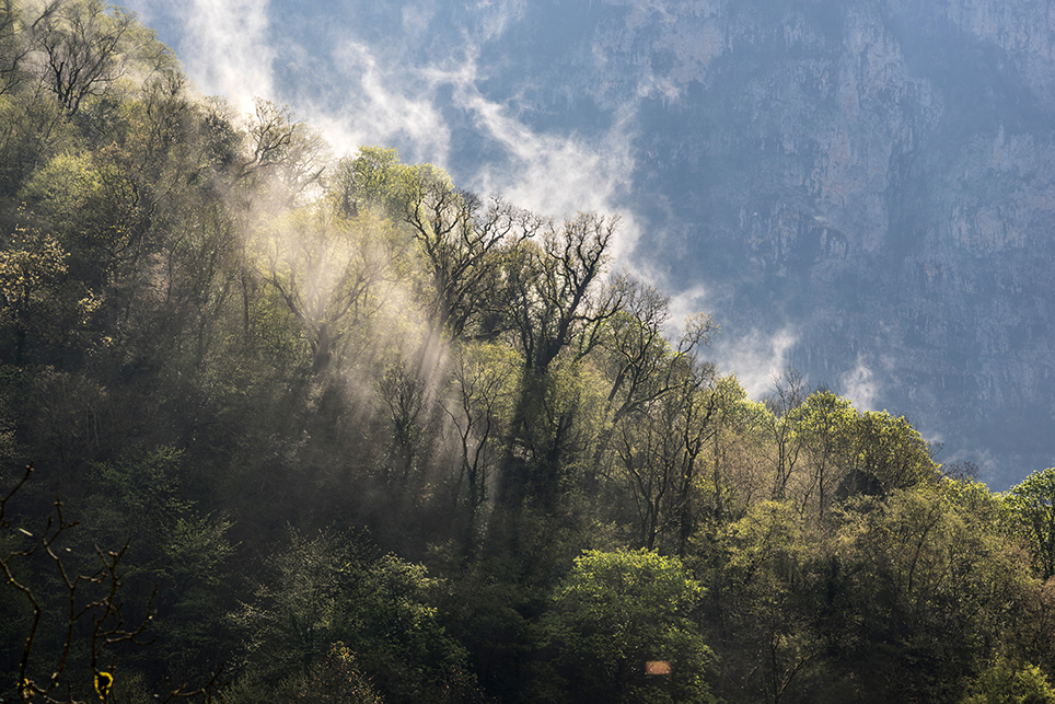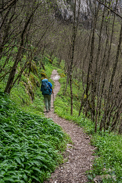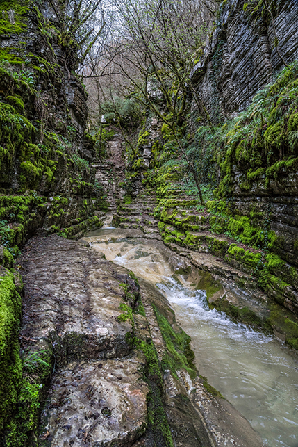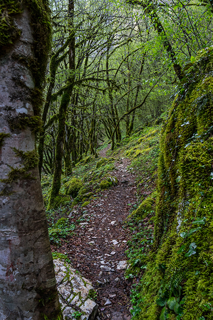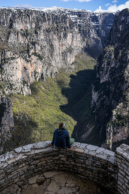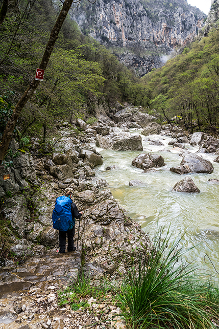 Ein gut ausgebauter Pfad führt von Monodendri etwa 500 Höhenmeter hinab in den Grund der Schlucht. Bald verengt sich das Tal, die Felswände steigen steil empor, und kaum ein Sonnenstrahl dringt bis zum Boden. Saftiggrüner Bärlauch bedeckt den schattigen Boden, dicke Moospolster umhüllen die feuchten Felsen und Baumstämme. Nur ein schmaler Pfad windet sich unweit des laut rauschenden Vikos durch die enge Schlucht; Forstwege oder abseits liegende Baumstümpfe gibt es hier nicht – ein Stück Urwald hat sich hier unten noch erhalten. Etwa in der Mitte der zwölf Kilometer langen Schlucht erreichen wir die Klima-Quelle. Dahinter wird die Schlucht heller, sonniger – und rasch grüner. Die Buchen tragen ihre ersten Blätter, hellgrün und voller Leben, während Vögel fröhlich ihre Lieder vom beginnenden Frühling singen. Die Felswände reichen nun nicht mehr so weit hinab und in der Ferne hören wir das Glockenläuten einer Ziegenherde, die auf die sonnigen Hänge getrieben wird.