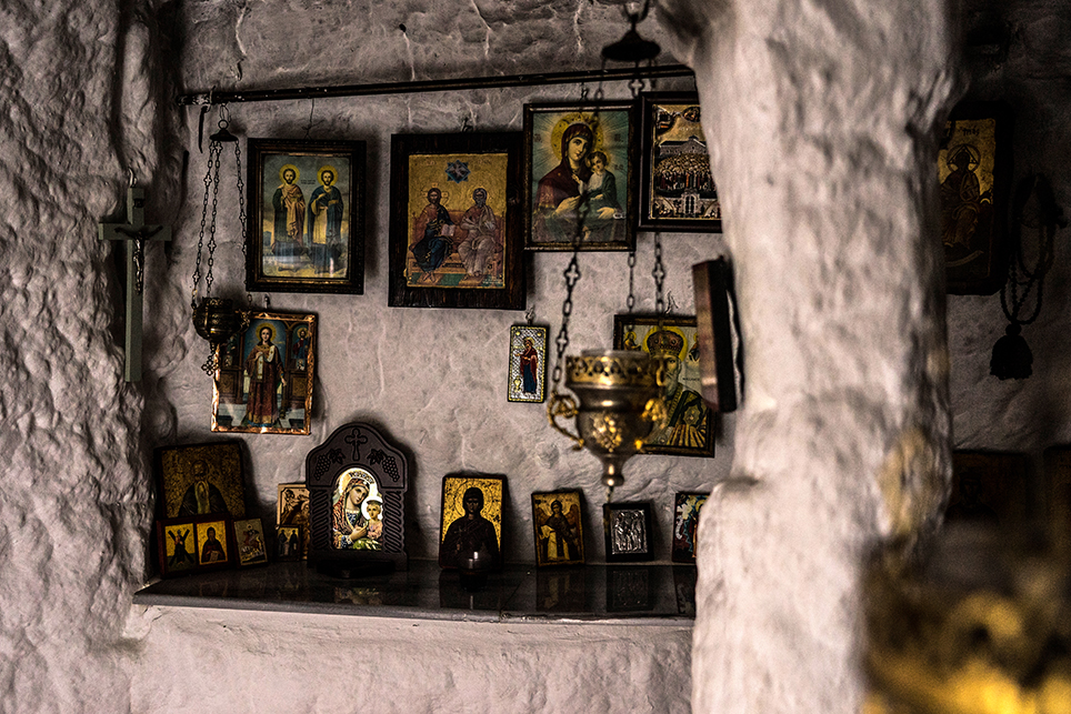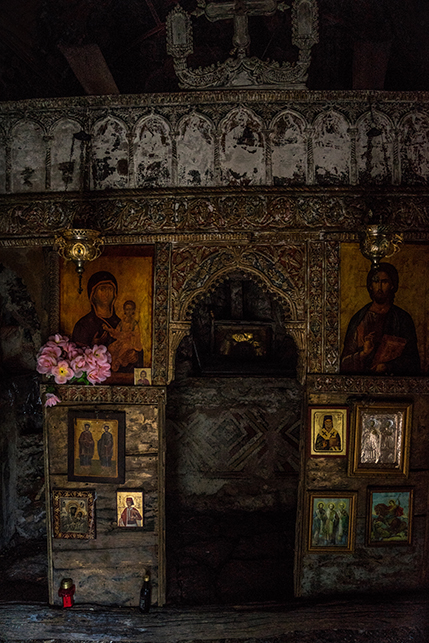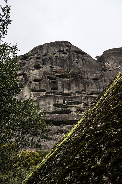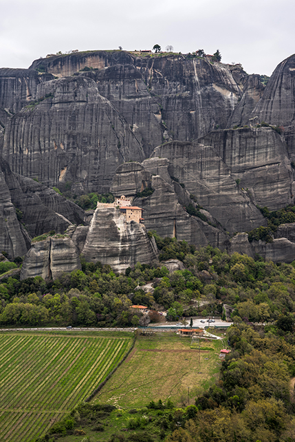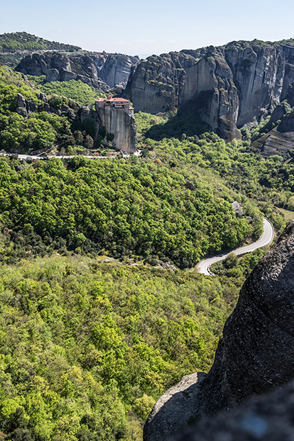 Am nächsten Morgen ist es immer noch kalt und regnerisch. Auf dem Weg nach Kalambaka trauen wir unseren Augen kaum: Über Nacht hat es bis auf 600 Meter heruntergeschneit – und das Mitte April, während in Deutschland bereits frühsommerliche Wärme herrscht. Kalambaka ist bekannt für die Klöster von Meteora, die auf bis zu 400 Meter hohen Sandsteinfelsen thronen. Wie die Mönche diese mauerglatten Felsnadeln bestiegen haben, bleibt für uns ein völliges Rätsel – die spärlichen Überlieferungen sprechen von Leitern, Strickleitern und Seilzügen, doch es dürfte kaum mehrere hundert Meter hohe Leitern gegeben haben und für Strickleitern musste irgendwer schließlich irgendwann zuerst hinauf.