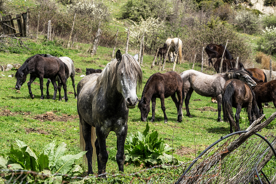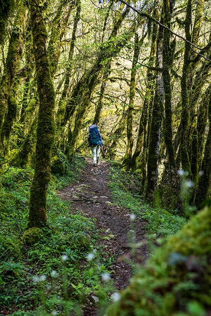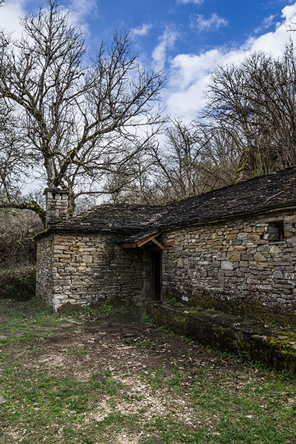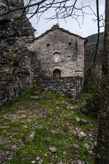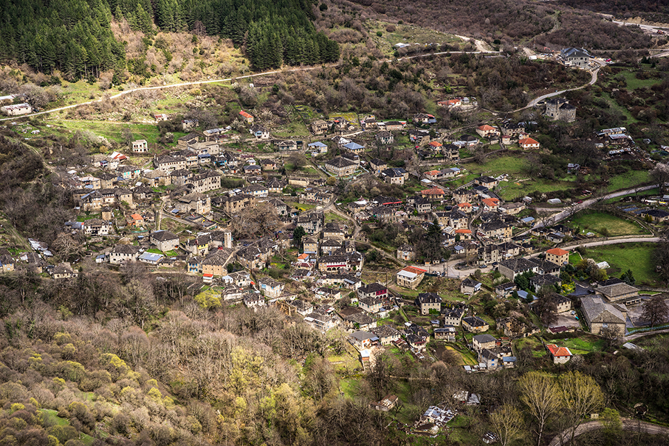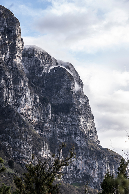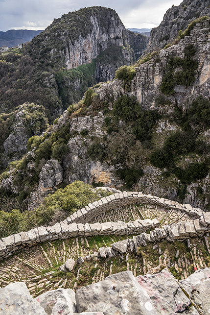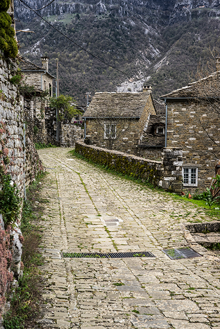 Wer, wie wir, auf dem Trek ins Innere der Zagoria-Region vordringen will, der muss allerdings erst einmal einige Höhenmeter überwinden, geht es die ersten anderthalb Tage doch fast beständig bergauf. Der Morgenregen glitzert noch auf den Blättern des buschartigen Eichenwaldes über dem Dorf Klidonia, als wir in sanften Serpentinen an Höhe gewinnen und schon bald über den Nebeln auf die Felswände des Tymfi-Massivs blicken. In Papigo, eigentlich das meistbesuchte Dorf im Zagori, ist es im April noch herrlich ruhig. Wie die gesamte Region wurde auch Papigo wegen seiner traditionellen Bauweise 2023 zum UNESCO-Weltkulturerbe erklärt. Zagori ist Steinland: enge Gassen, hohe Trockenmauern, Häuser mit Schieferdächern. Ein archaisches Gesamtbild, das trotz oder vielleicht gerade wegen der Bergflucht erstaunlich gut bewahrt wurde.