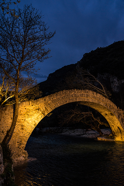 Am Ende der Vikos-Schlucht, an der Quelle des Voidomatis, würde der in unserem Wanderführer beschriebene Trek nach rechts aus der Schlucht führen – zurück nach Papigo und schließlich nach Klidonia. Wir jedoch wollen nicht denselben Weg zurückgehen. Ein Versuch, der Schlucht weiter zu folgen, scheitert schon bald an dichtem Dornengestrüpp. Also steigen wir auf einem gepflasterten Serpentinenweg nach Vikos auf, der immer wieder herrliche Ausblicke zurück in die Schlucht bietet. Einziger Nachteil: Nach Vikos folgt ein mehrere Kilometer langer Asphaltabschnitt. Zum Glück nimmt uns ein freundliches Paar aus Israel bis zur Aristis-Brücke mit. Zwischen Platanen folgen wir einem wunderschönen Pfad am Flussufer des Voidomatis entlang, passieren eine kleine Kapelle mit verwitterten Fresken und steinzeitliche Höhlen, bevor wir schließlich die Steinbogenbrücke bei Klidonia erreichen. Beschwingt wandern wir die letzten anderthalb Kilometer zur Bushaltestelle in Klidonia. Es regnet, und die lokale Busgesellschaft schafft es, unseren Puls noch einmal in die Höhe zu treiben: Wir warten im strömenden Regen bis 23 Uhr auf den verspäteten Bus. Schon haben wir uns in der nahen Wiese zum Zelten gesehen, als endlich der Bus erscheint und uns in äußerst entspannter Fahrweise zurück nach Ioannina bringt.
