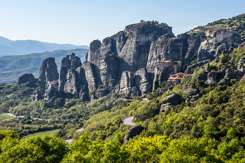 Sechs der ehemals vierundzwanzig Klöster des weltberühmten UNESCO-Weltkulturerbes sind heute noch bewohnt und zugänglich, entsprechend groß ist der Besucherandrang. Abseits der Hotspots verlieren sich die Massen jedoch: Wir wandern allein auf schmalen Pfaden zwischen den Felsen und erklimmen mithilfe eines alten Steigs und mehrerer Leitern sogar einen der Felstürme. Von dort oben bietet sich uns eine atemberaubende Aussicht über den südlichen Pindos, während die Häuser Kastrakis, des ruhigen Bruders von Kalambaka, zu unseren Füßen liegen. Am Abend sitzen wir in einem kleinen Restaurant bei Pita, Feta und Gyros, während hoch über uns die Felsen von Meteora im Mondlicht schimmern – ein würdiger Abschluss unserer Reise durch Griechenlands wildes Herz.