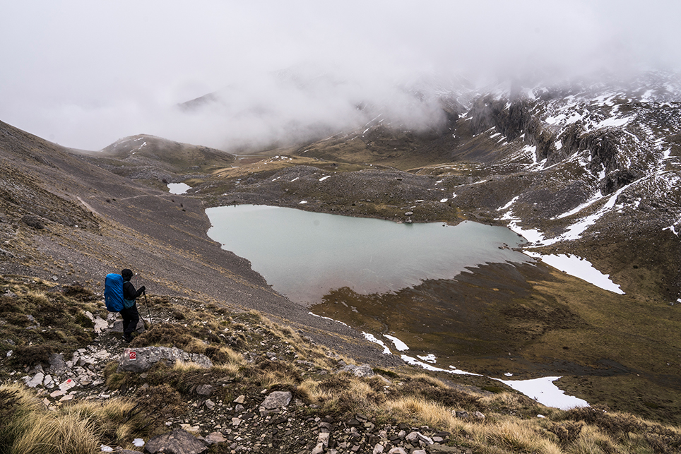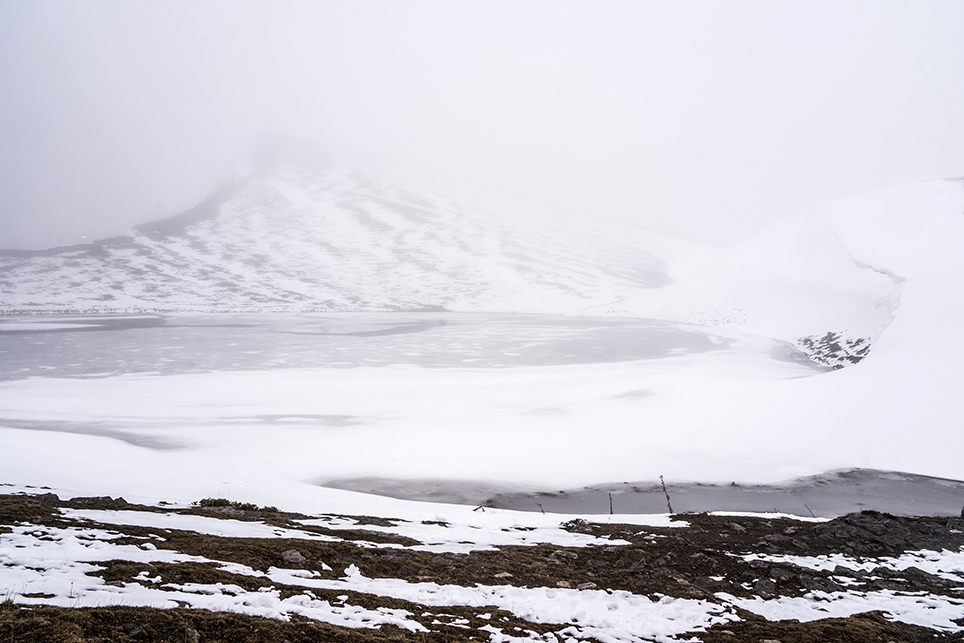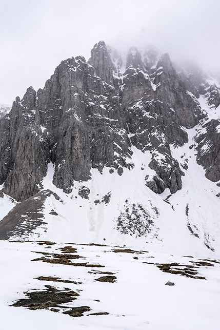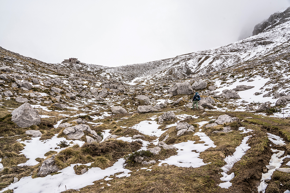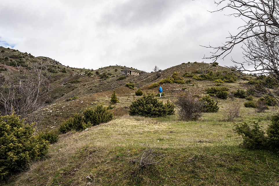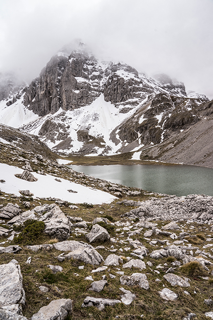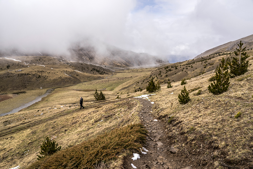 Über aussichtsreiche Wiesenhänge und später durch schneebedeckte Blockfelder steigen wir weiter zur Astraka-Hütte hinauf. Auf fast 2.000 Metern gelegen, ist sie erst ab Mai geöffnet – wir tragen unser Zelt also nicht umsonst. Im Wanderführer wird der etwa anderthalbstündige Abstecher zum Drachensee empfohlen, doch der alpine See schämt sich unserer wohl, versteckt er sich nicht nur im Nebel und einem aufkommenden Schneesturm, sondern auch unter einem dicken Schnee- und Eispanzer. Ja, wir haben insgesamt etwas Pech mit dem Wetter, denn während es in Deutschland trocken ist und bereits fast sommerliche Temperaturen herrschen, gibt es in Griechenland jeden Tag Schauer und am Ende sogar Schneefall bis hinab auf 600 Meter Meereshöhe – und das Mitte April.