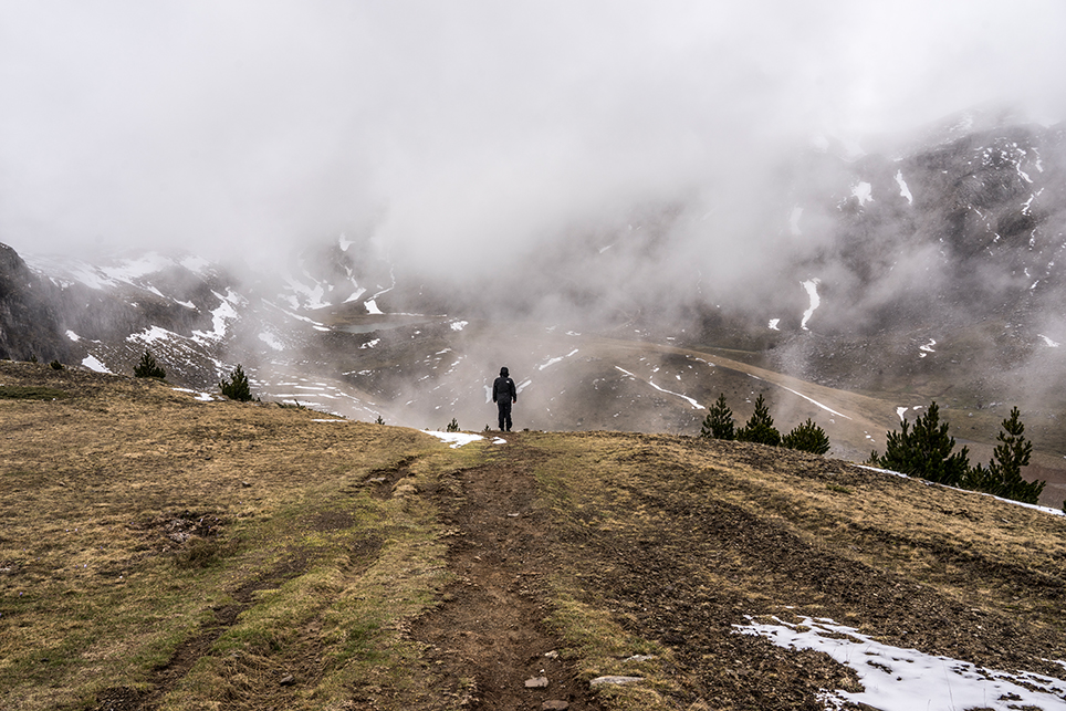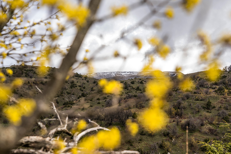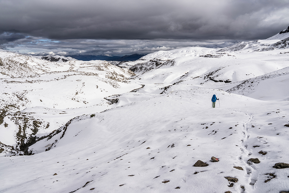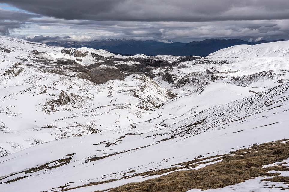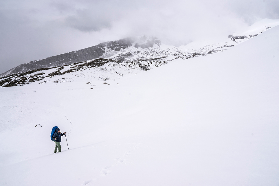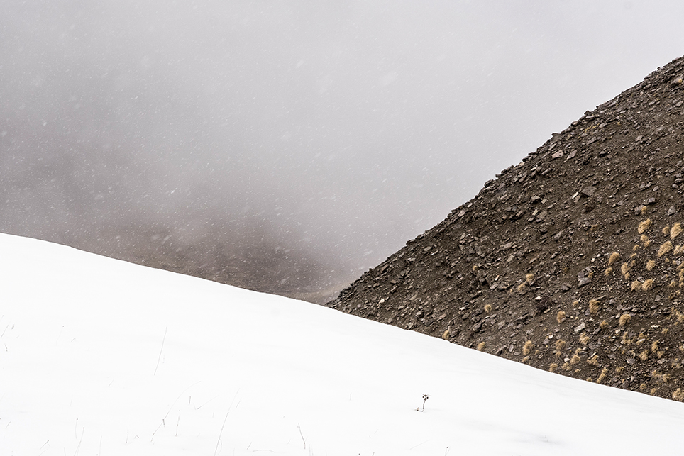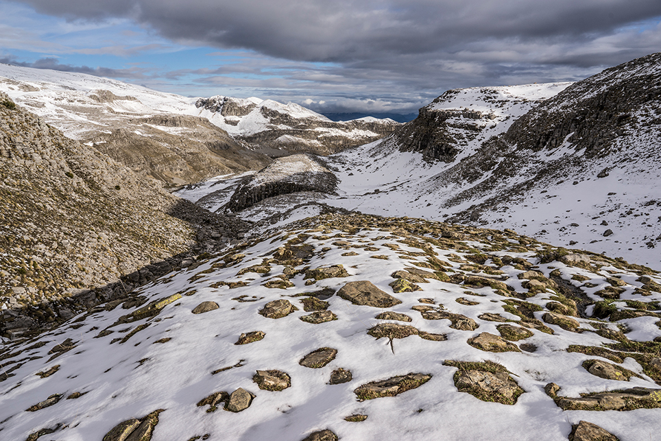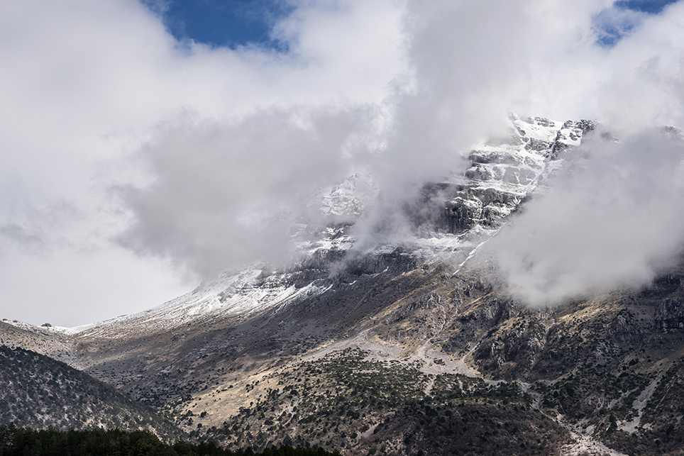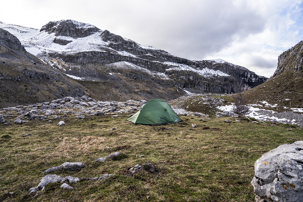 Nach dem Abstecher überqueren wir im dichten Schneefall eine weite, tief verschneite Hochfläche. Schritt für Schritt arbeiten wir uns voran, sinken immer wieder bis zur Hüfte in den weichen Schnee ein. Doch als wir den Sattel oberhalb der Megas-Lakos-Schlucht erreichen, reißt die dunkle Wolkendecke völlig unvermittelt auf. Die vor uns liegende Schlucht erstrahlt im warmen Licht der bereits tief stehenden Sonne – und uns wird klar: Für genau solche Momente lohnt sich jede Mühe. Mit jedem Meter, den wir weiter absteigen, wird die Schneedecke dünner und erste grasige Polster erscheinen zwischen dem feuchten Weiß. Noch etwas tiefer, auf einer schneefreien Terrasse, schlagen wir unser Zelt auf und genießen die Stille des Pindos.