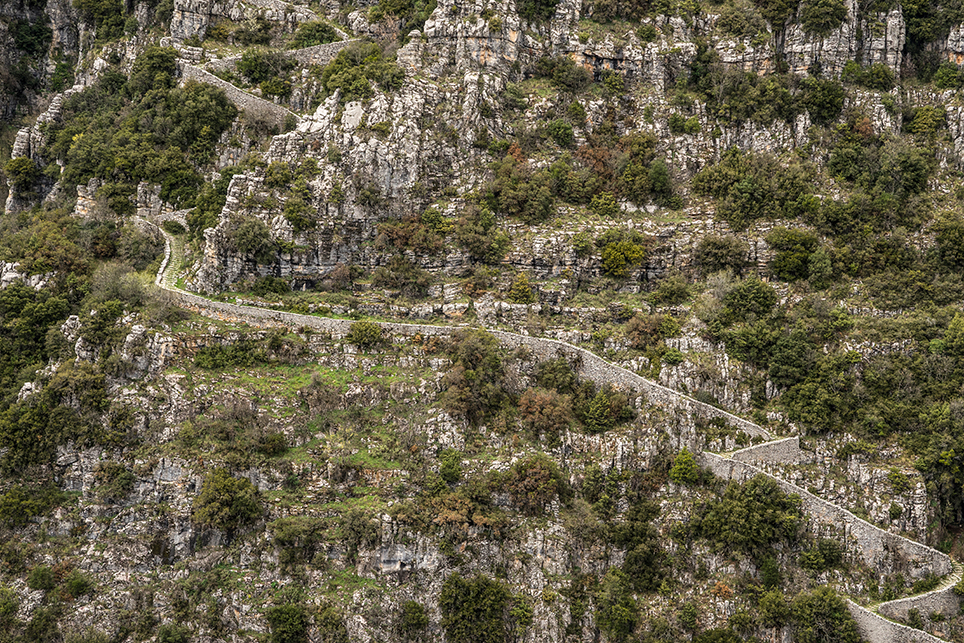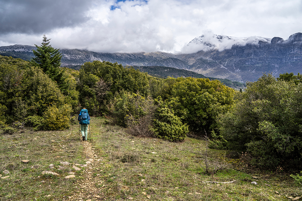 Griechenland. Denkt man da nicht zuerst an sonnige Strände, an weiße Häuser mit blauen Fassaden und das weite Meer? Dabei ist das Land in Wahrheit ein Reich der Berge – 78 Prozent seiner Fläche bestehen aus Steilküsten, Gebirgen, Schluchten und Hochebenen. Im äußersten Nordwesten, nahe der Grenze zu Albanien und Nordmazedonien, erhebt sich eines dieser Gebirge: der Pindos. Es ist ein wildes Land und so abgelegen, dass manche Dörfer bis in die 1970er Jahre ausschließlich zu Fuß erreichbar waren. Im Herzen des Pindos liegt Zagori – eine Großgemeinde von annähernd 1.000 Quadratkilometern, etwas größer als Berlin, mit nur rund 3.700 Einwohnern jedoch so dünn besiedelt wie Island oder Australien. Eines sei vorweggenommen: Einen „Zagoria-Trek“ im eigentlichen Sinne gibt es nicht. Die siebentägige Route folgt vielmehr einem Geflecht uralter Pfade, die einst die Bergdörfer miteinander sowie mit ihren Weide- und Jagdgebieten verbanden. Heute sind sie teilweise markiert und bilden eines der schönsten Wandergebiete Griechenlands.