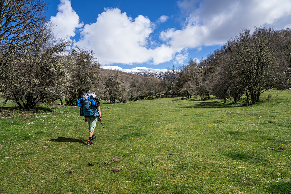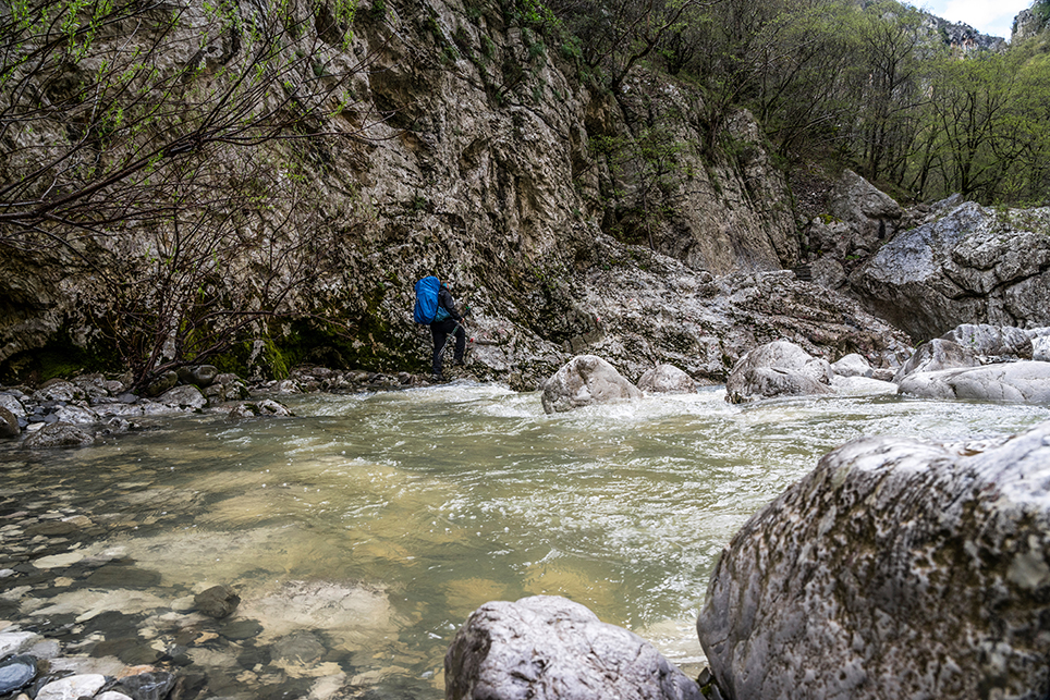 Auf dem Rückweg steigen wir in die Vikaki-Schlucht hinab. Woanders wäre sie eine Hauptattraktion – hier ist sie nur eine von vielen – und dennoch ein landschaftlicher Leckerbissen erster Güte. Am Ende der Schlucht sollten wir eigentlich wieder auf die normale Route stoßen, doch der Regen der vergangenen Tage hat den Fluss so weit anschwellen lassen, dass er den gesamten Schluchtengrund füllt. Der Ausgang liegt nur fünfzig Meter entfernt, ist jedoch unerreichbar, getrennt von überhängenden Felswänden und tosendem Wasser. Es ist bereits 19:30 Uhr, die Dämmerung bricht herein, und Zeltmöglichkeiten gibt es in der engen Schlucht keine. Wir überlegen, wie wir weiterkommen – bis wir eine große, trockene Höhle oberhalb des Pfades entdecken und uns für ein Biwak entscheiden. Was als Notlösung beginnt, wird zur schönsten Nacht der Reise: ein aussichtsreicher, dennoch geschützter Felsvorsprung, ein kleines Feuer und die tiefe Stille über dem Tal; am Morgen zeigt sich gegenüber sogar ein Braunbär – ein unvergesslicher Moment.
